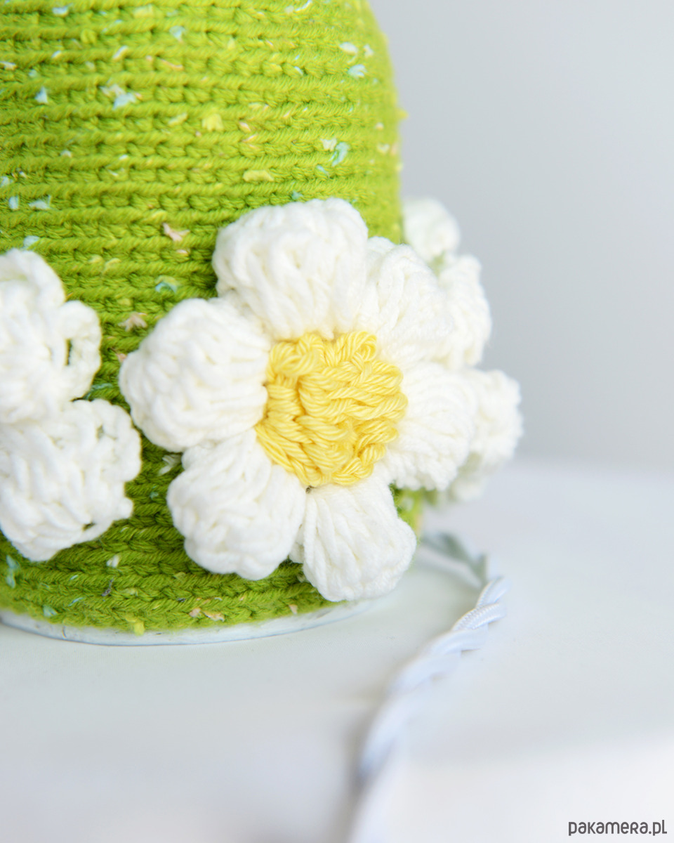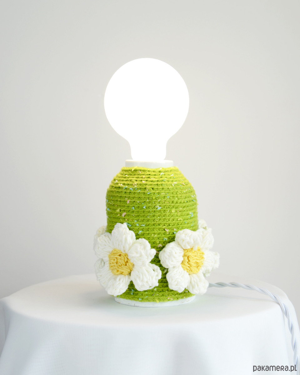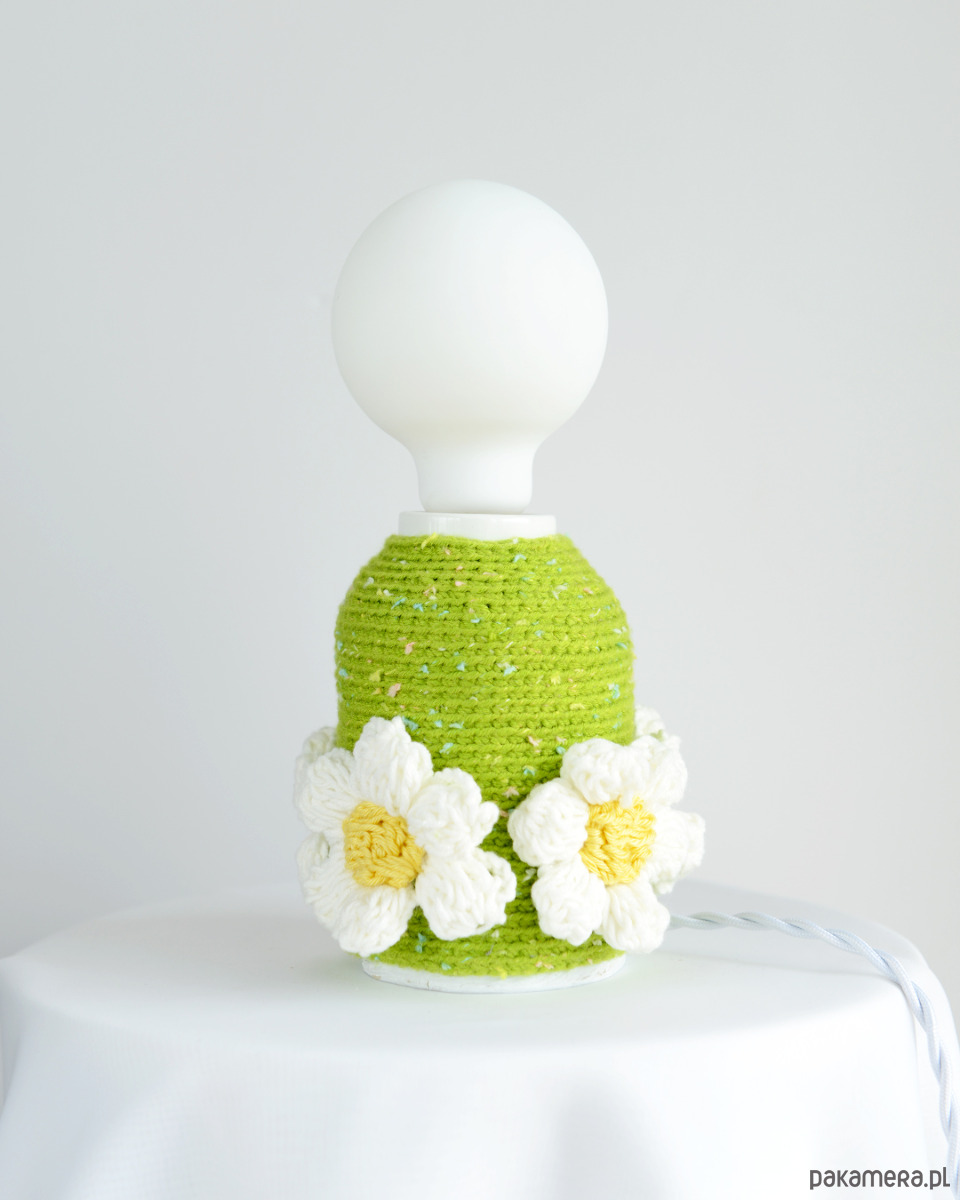Lampa w rozmiarze XS z kolekcji „Blossom” to miniaturowy cud. Jej podstawa, wykonana z samoutwardzalnej gliny, zapewnia solidną konstrukcję. Abażur, misternie wykonany na szydełku w trawiastym odcieniu, jest ozdobiony delikatnie dzierganymi białymi stokrotkami. Lampa jest ręcznie robiona, co sprawia, że każdy egzemplarz jest unikalny. Dekoracyjny splot jest zdejmowany, co ułatwia pielęgnację lampy i czyszczenie jej poszczególnych elementów.