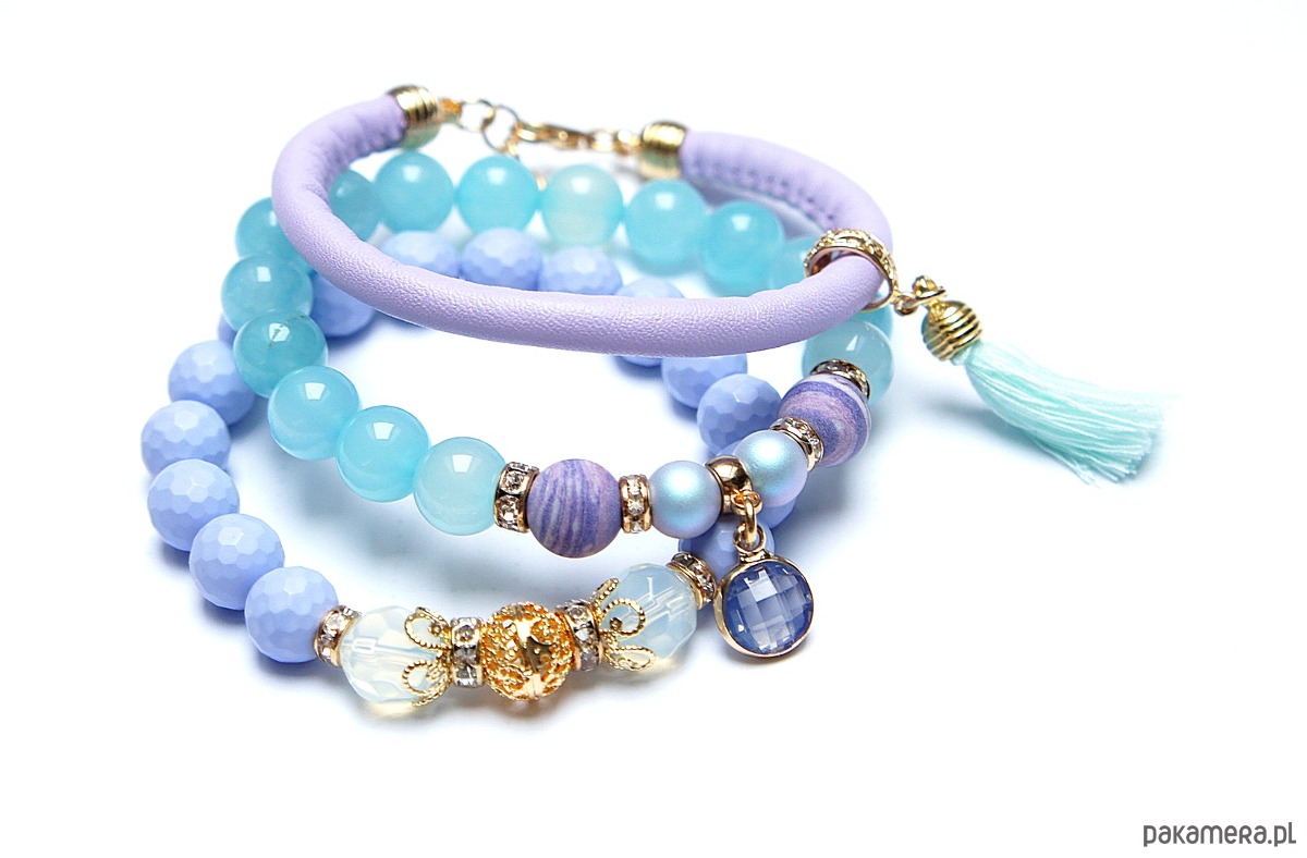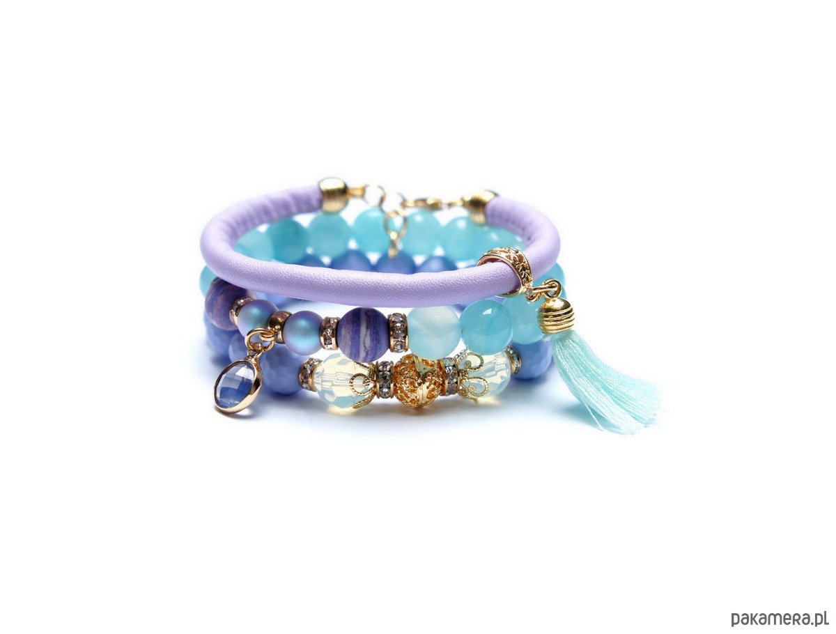 Komplet trzech bransoletek wykonanych z naturalnych kamieni - agaty [10mm], muszla fasetowana [10mm], turkus rekonstruowany [10mm], perły majorka [8mm], kryształki fasetowane [10mm], rzemienia z ekologicznej skóry [śr. 5mm], chwostu, zawieszki ze szkła w okuciu oraz elementów metalowych w kolorze złotym. Bransoletki pasują na nadgarstek 16 - 17cm.