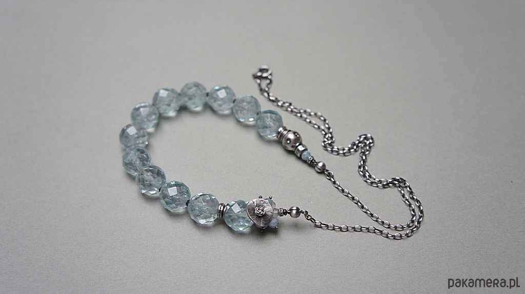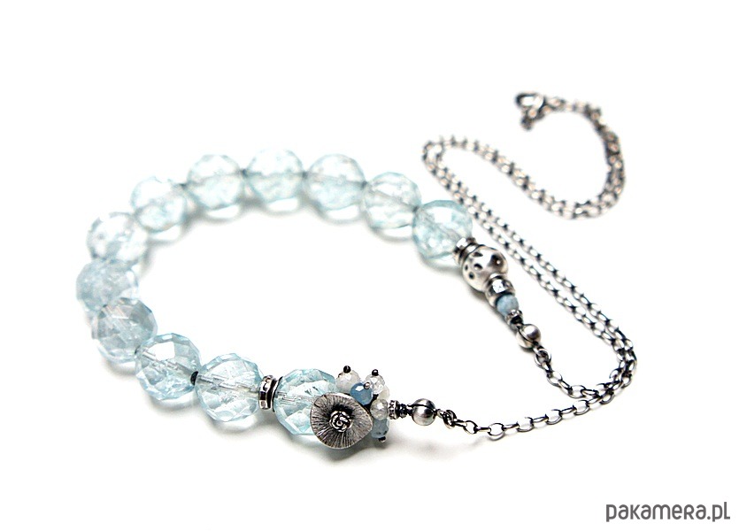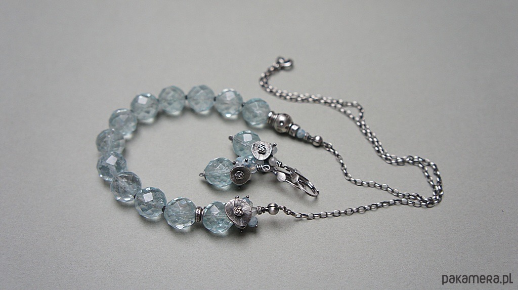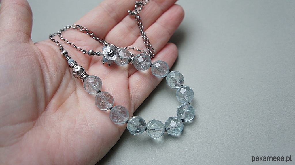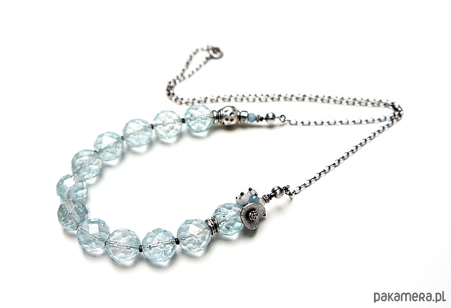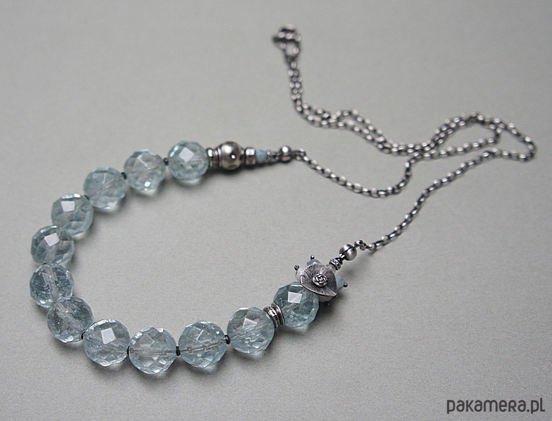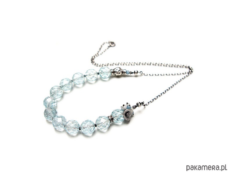 Naszyjnik wykonany ze srebra [pr. 925] w połączeniu z wysokiej jakości fasetowanymi kuleczkami kwarców aqua [12mm -kamienie posiadają naturalne liczne inkluzje ] ,fasetowanymi akwamarynami [4mm] ,kamieniami księżycowymi [4mm] ,topazami [3mm] . Całość oksydowana i przetarta. Całkowita długość naszyjnika około 57,5cm. Biżuteria ozdobnie zapakowana.