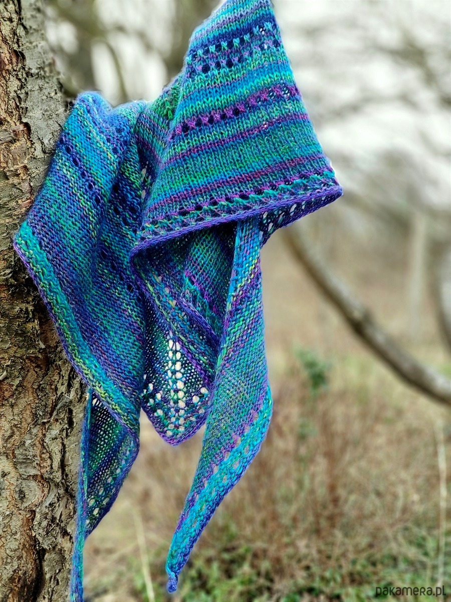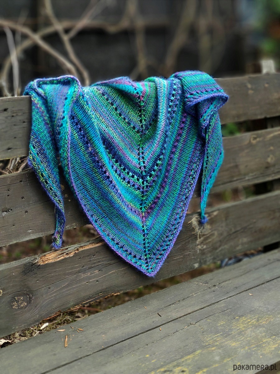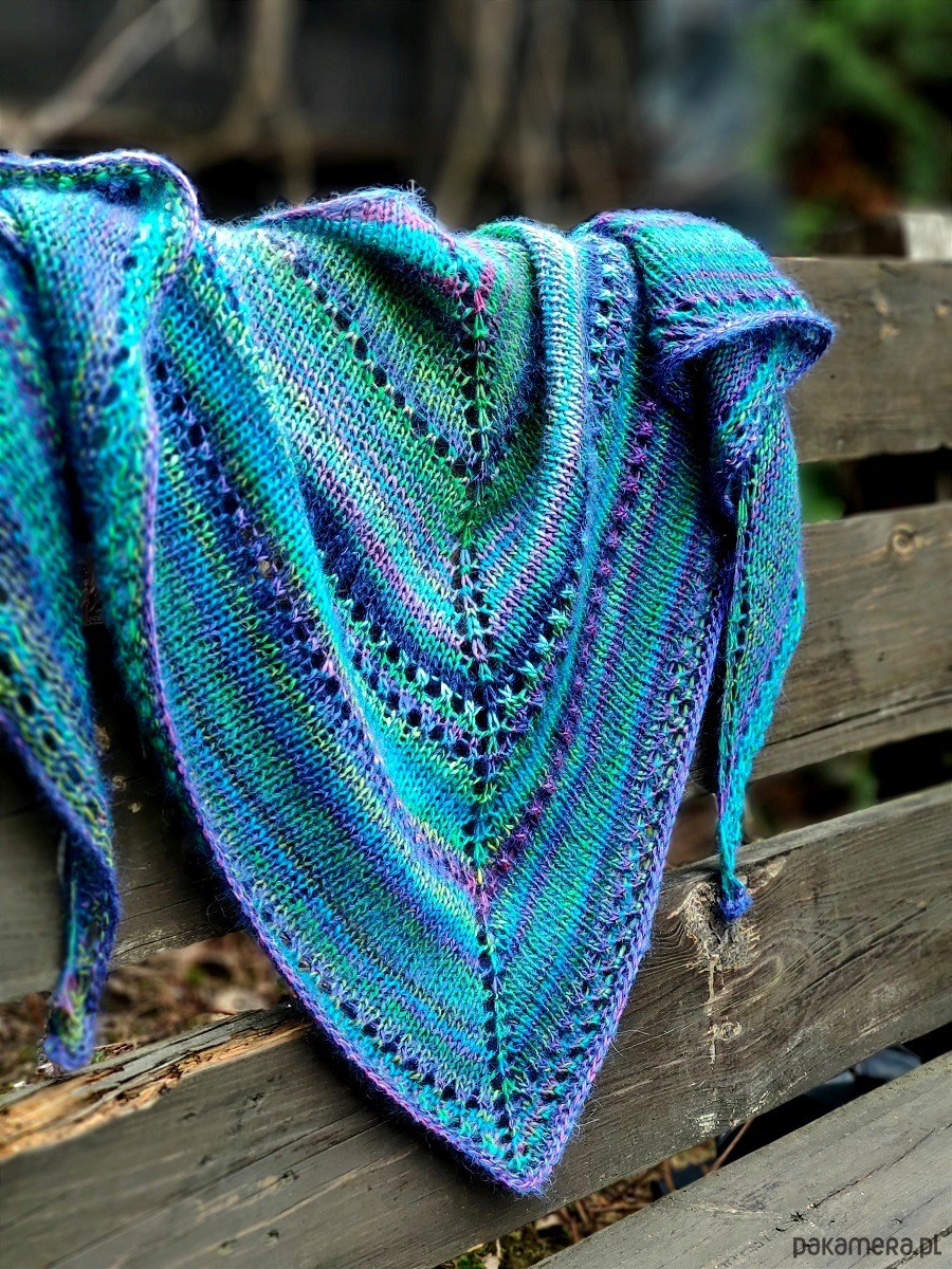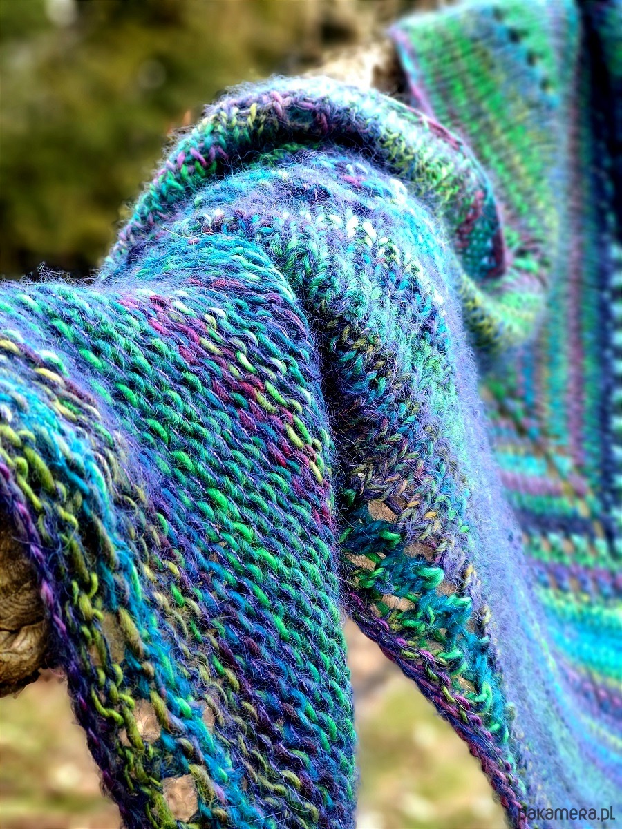 Dość mięsista, ale miękka, puszysta i lejąca chusta, wykonana ręcznie na drutach z wysokiej jakości włóczek.