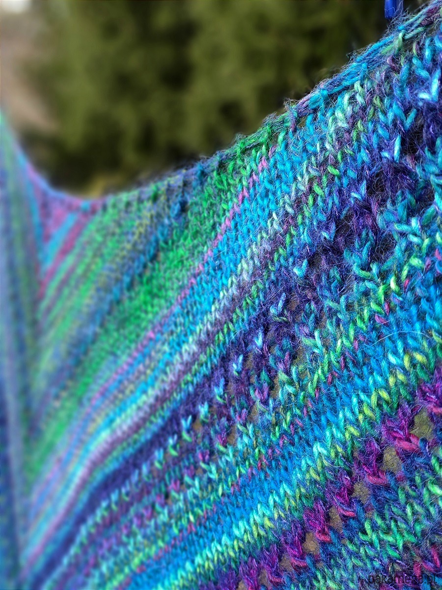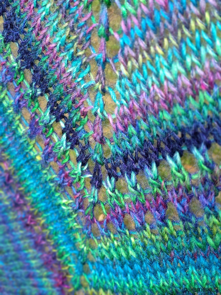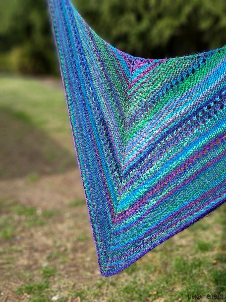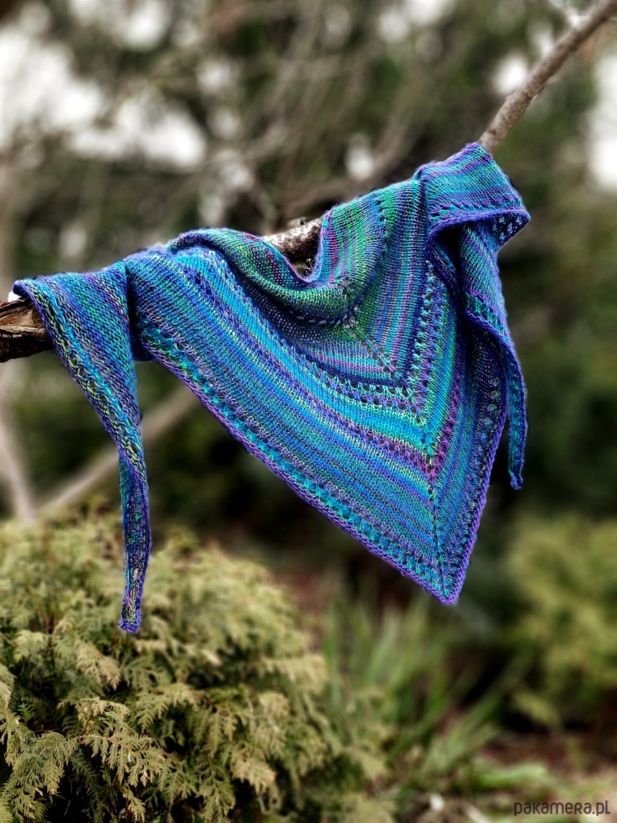 Dość mięsista, ale miękka, puszysta i lejąca chusta, wykonana ręcznie na drutach z wysokiej jakości włóczek.