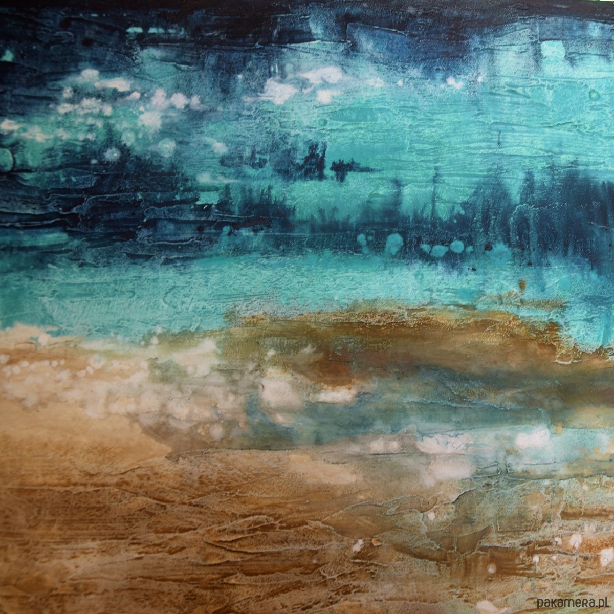 Obraz malowany w technice akrylowej, częściowo w technice pouringu, z grubą, wyraźną strukturą, na płótnie naciągniętym na blejtram (drewnianą ramę) o grubości ok. 2 cm.