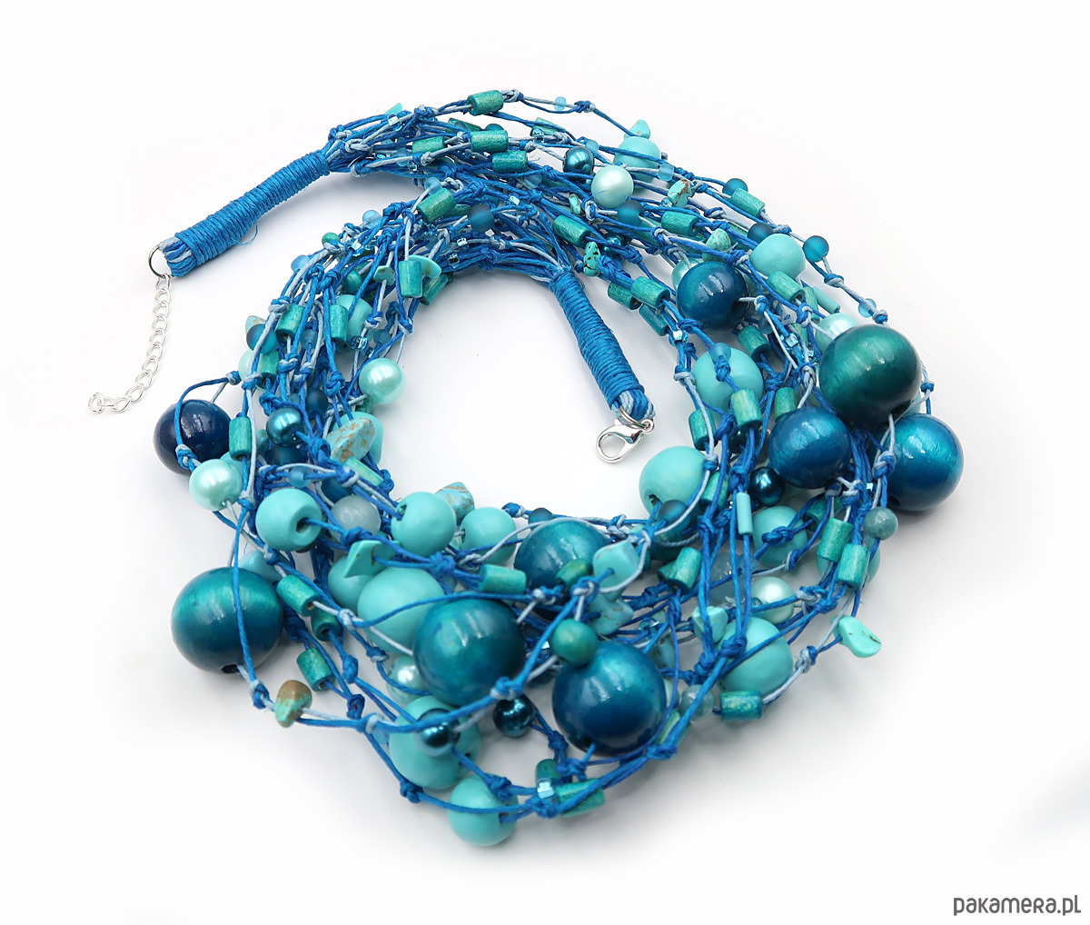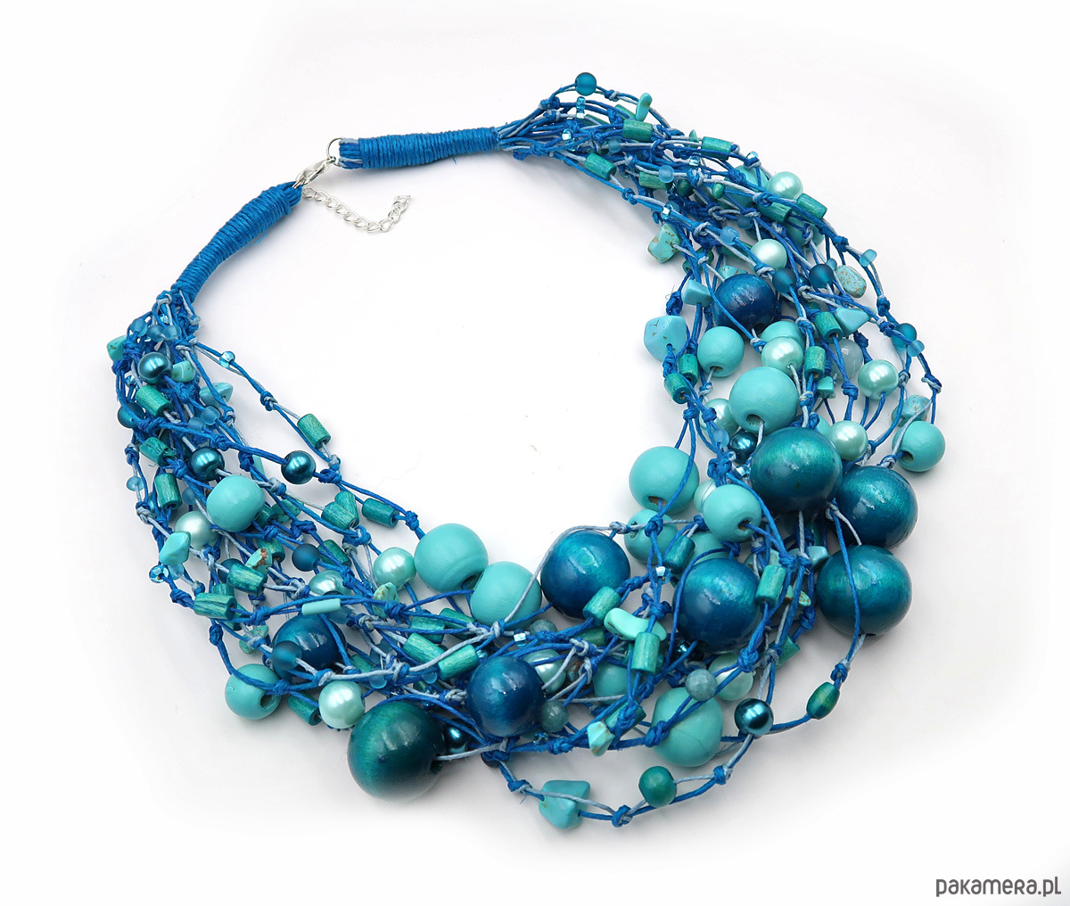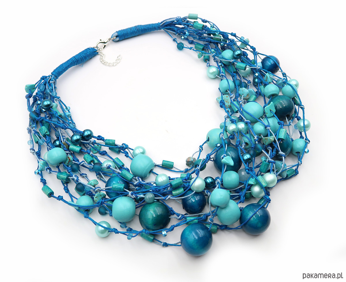 Naszyjnik dla marzycielki, miłośniczki natury i kobiety z wyobraźnią. Wykonany na naturalnej przędzy lnianej z elementów w odcieniach błękitów, lazuru i turkusów. W naszyjniku znajdują się korale szklane, drewniane, szklane perełki, turkus, howlit, czeskie szkło Jablonex . Długość ok. 48 cm, regulacja długości, zapięcie posrebrzane.
