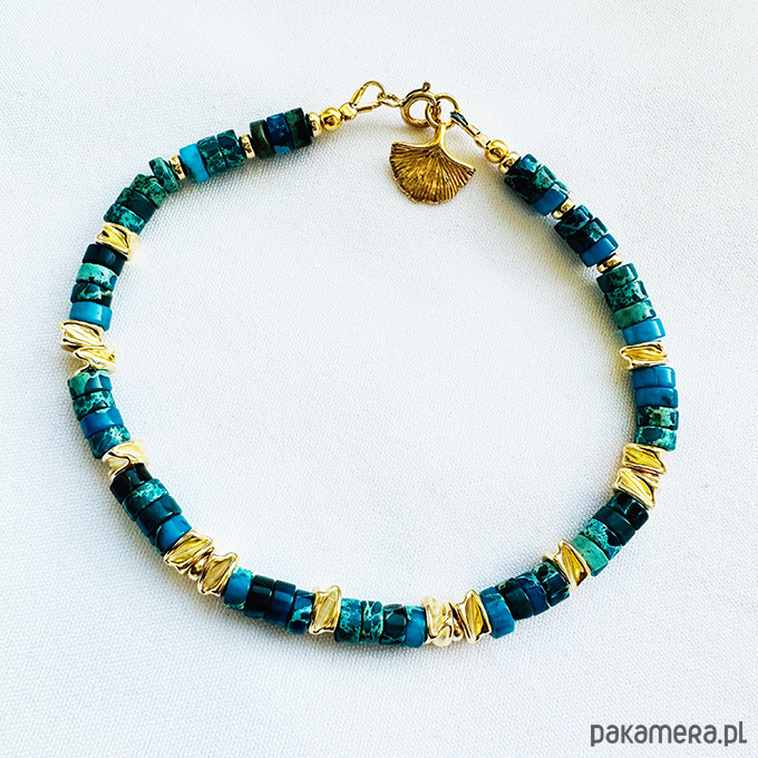BLUE SPRING - Bransoletka z kamieni, jaspis cesarski, złoty liść