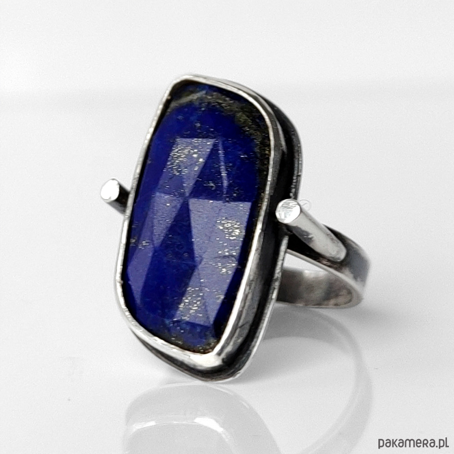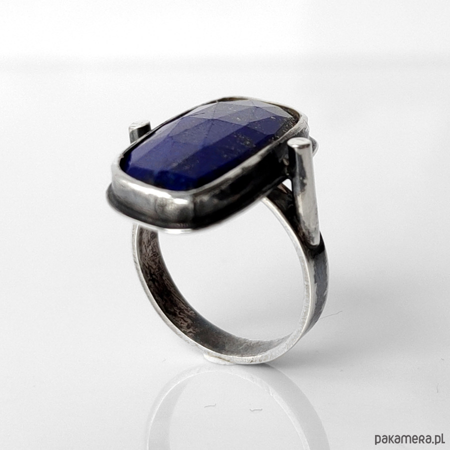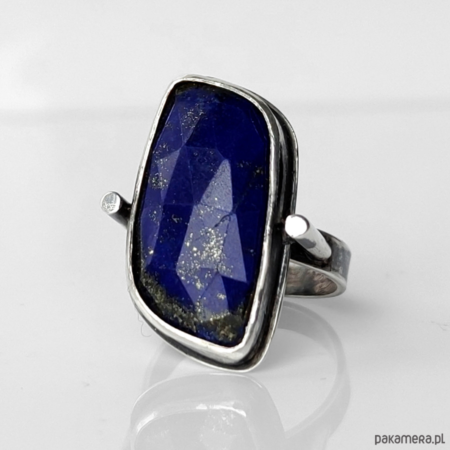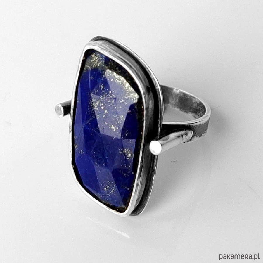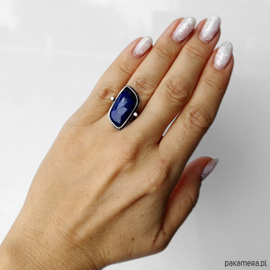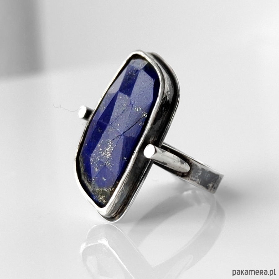 Elegancki, srebrny pierścionek z lapis lazuli. Pierścionek zdobi fasetowany kaboszon lapis lazuli. Całość wykonana ręcznie w jednym niepowtarzalnym egzemplarzu. Pierścionek został zoksydowany i wypolerowany. Wymiary korony pierścionka: ok 17x26mm. Rozmiar obrączki 13. Biżuteria zostanie ozdobnie zapakowana.