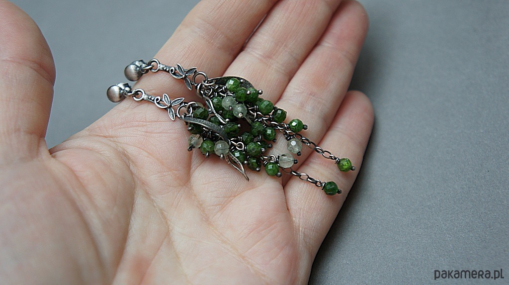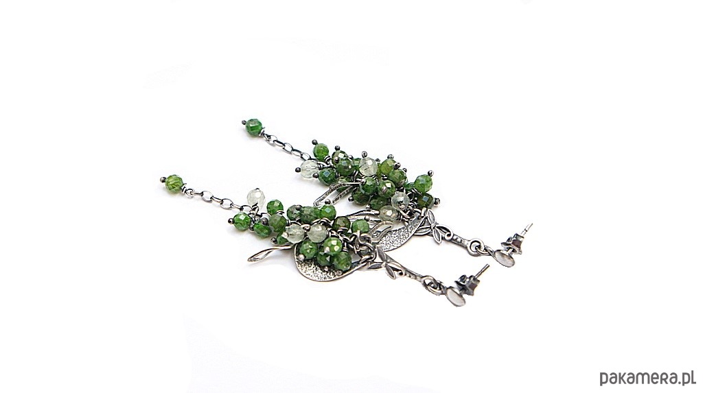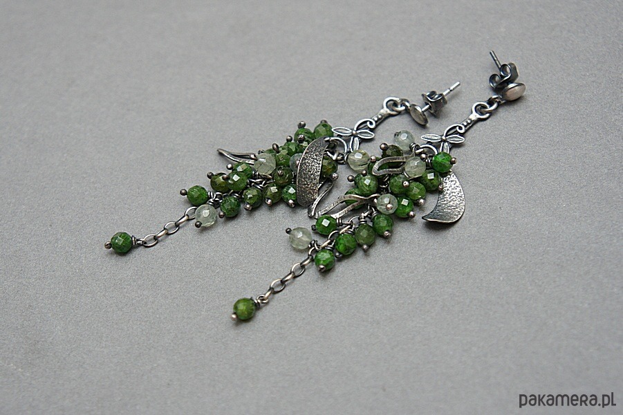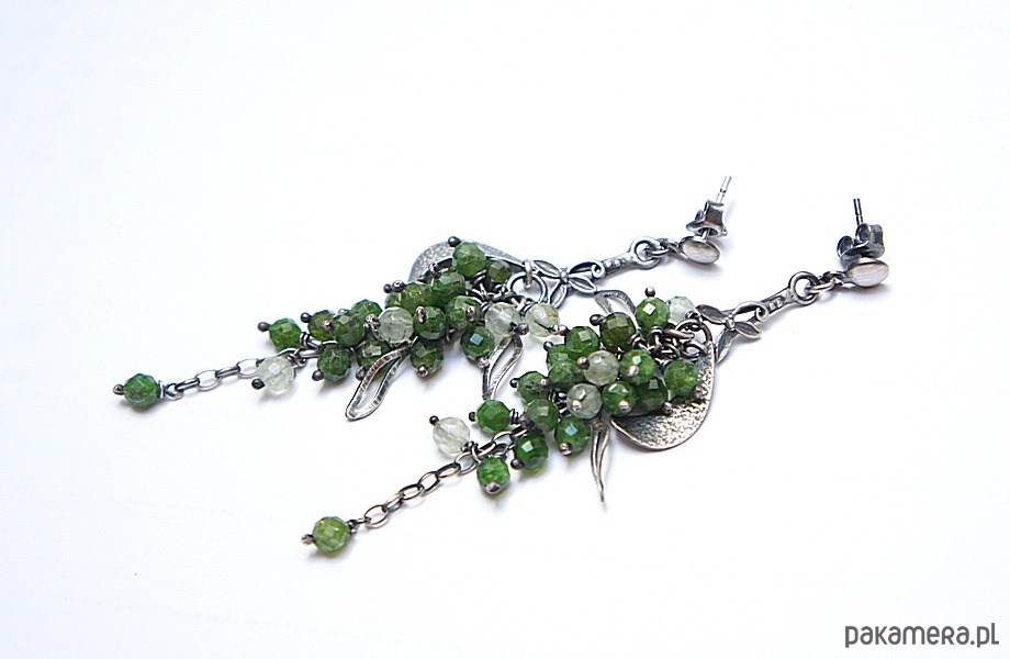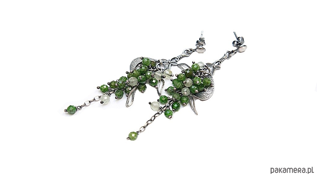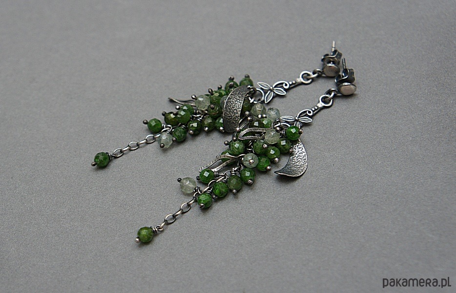 Kolczyki wykonane ze srebra w połączeniu z fasetowanymi diopsydami [4mm], fasetowanymi frenitami [4mm] oraz srebrnymi płatkami. Całość oksydowana i przetarta. Całkowita długość kolczyków 7,5cm. Biżuteria ozdobnie zapakowana.