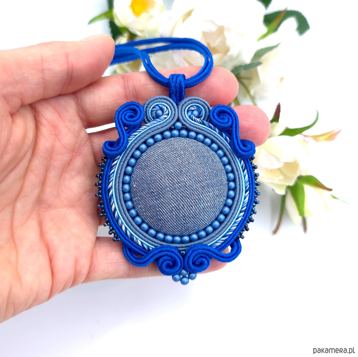Ten wyjątkowy wisiorek został wykonany techniką sutaszu i ozdobiony centralnym elementem z dżinsu, co nadaje mu nowoczesny, a zarazem casualowy charakter.