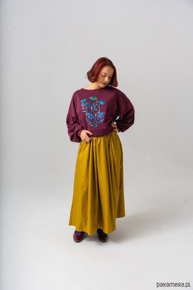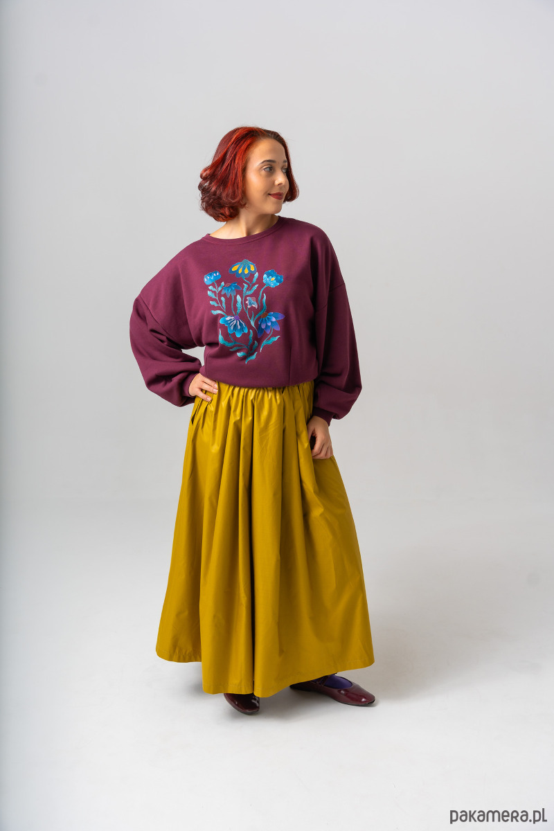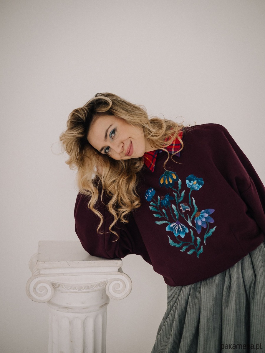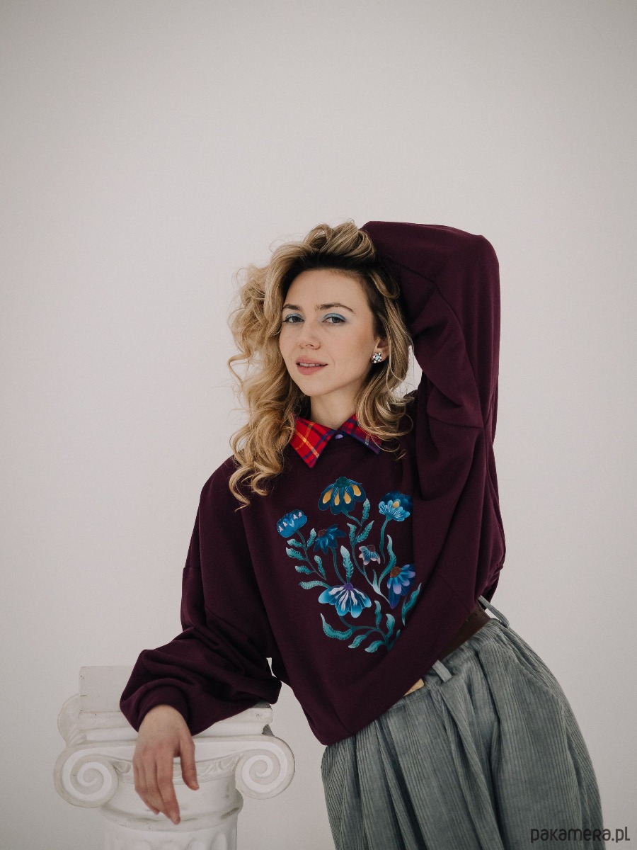Delikatna bluza z dzianiny dresowej pętelka w głębokim kolorze Cranaberry to propozycja dla miłośniczek oryginalnych printów. Autorski wzór kwiatowy zdobi front i dzięki wysokiej jakości druku pozostaje intensywny nawet po wielu praniach. Oversizowy krój i miękka dzianina o gramaturze 320 g zapewniają komfort i swobodę. Rękawy zakończone są szerokim ściągaczem uszytym z tej samej tkaniny, a dół bluzy ma tunel z gumą, który pozwala lekko regulować szerokość.
