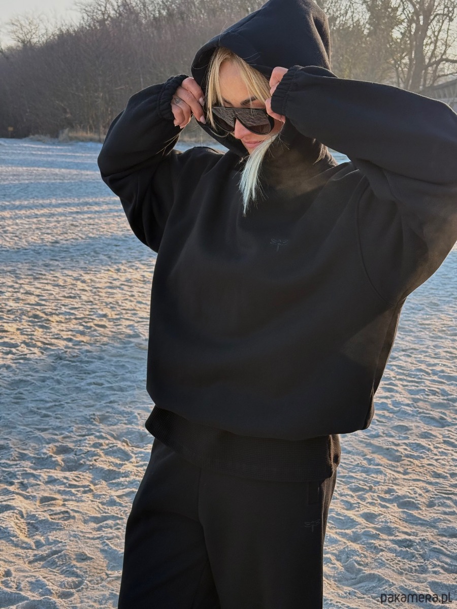 Mocno oversizowa bluza z kapturem i możliwością regulacji szerokości dzięki regulatorom w dolnej listwie. Obniżona linia ramion i mocno wydłużone, luźne rękawy zakończone ściągaczem. Dla kompletnego oversize looku dobierz do kompletu spodnie BELL lub DONNA w tym samym kolorze w rozmiarze większym niż nosisz na co dzień . Będzie wyglądała też bardzo modowo puszczona luźno z jeansami a nawet zwiewnymi spódnicami, takie połączenia kochamy najbardziej