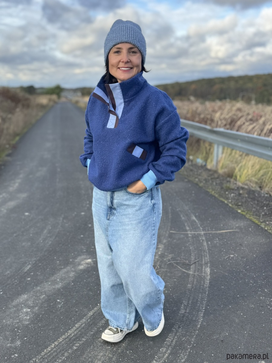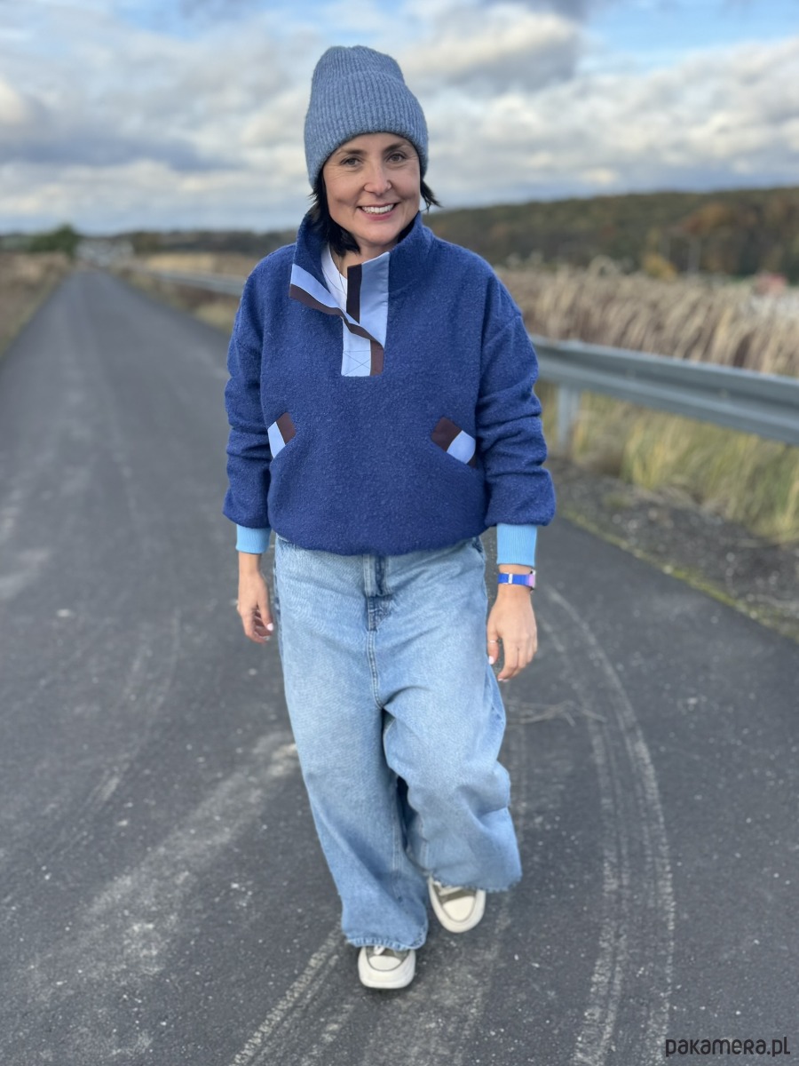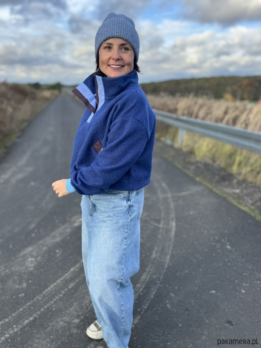 Bluza ma wygodną stójkę, chroniącą przed wiatrem, a przód został wykończony plisą w pasy niebiesko-brązowe, która przyciągają wzrok i dodaje całości lekko sportowego charakteru. Ten sam wzór pojawia się przy plisach kieszeni wpuszczanych, tworząc spójny i oryginalny detal.