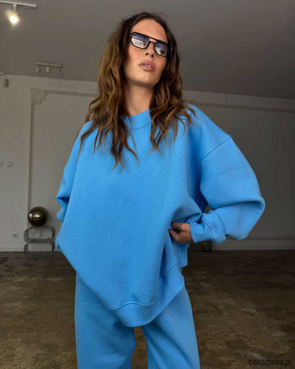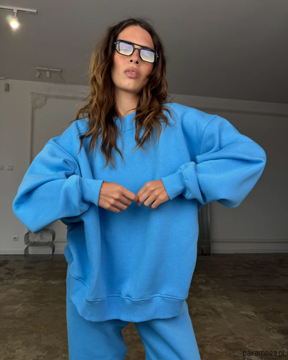 Model wykonany jest z mięsistej, wysokogatunkowej dzianiny, która przyjemnie układa się na sylwetce i zapewnia komfort noszenia przez cały dzień. To bluza, która pracuje z ciałem — nie ogranicza ruchów, a jednocześnie buduje nowoczesną, spokojną sylwetkę.