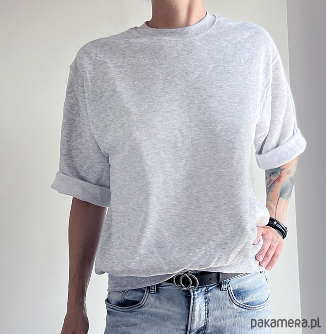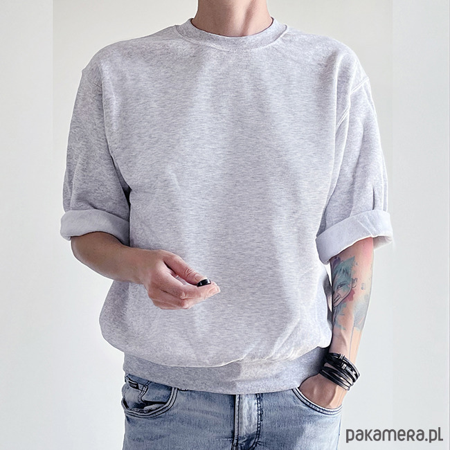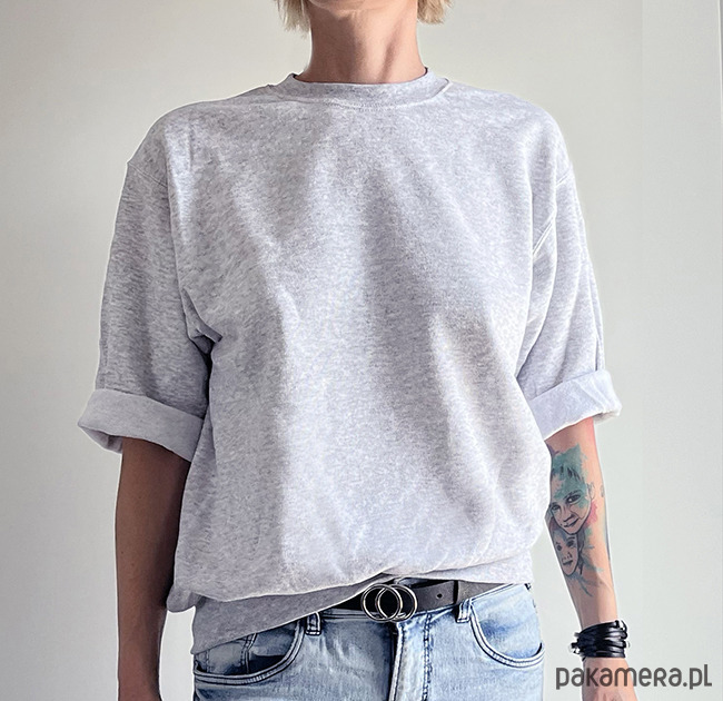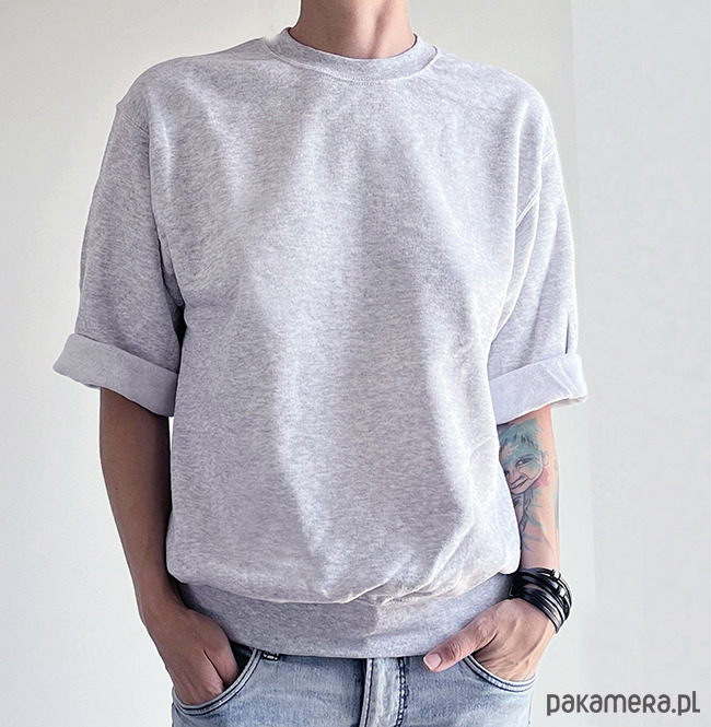 Wersja z krótkim rękawem. Niewielki okrągły dekolt, podwinięte rękawy.