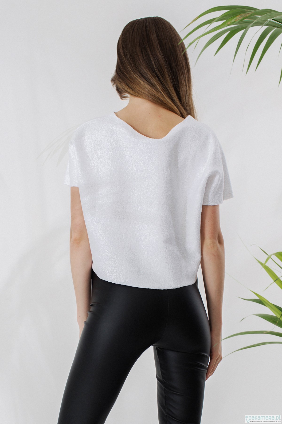 Krótka, szeroka bluza uszyta ze 100% bawełnianej dzianiny typu frotte w białym kolorze. Tył lekko wydłużony po łuku. XS dł. całkowita przód-41 tył-48 szerokość pleców 60 S dł. całkowita przód-41, tył-48 szerokość pleców 60 M dł. całkowita przód -42, tył-49 szerokość pleców 62 L dł. całkowita przód-42, tył-49 szerokość pleców 62