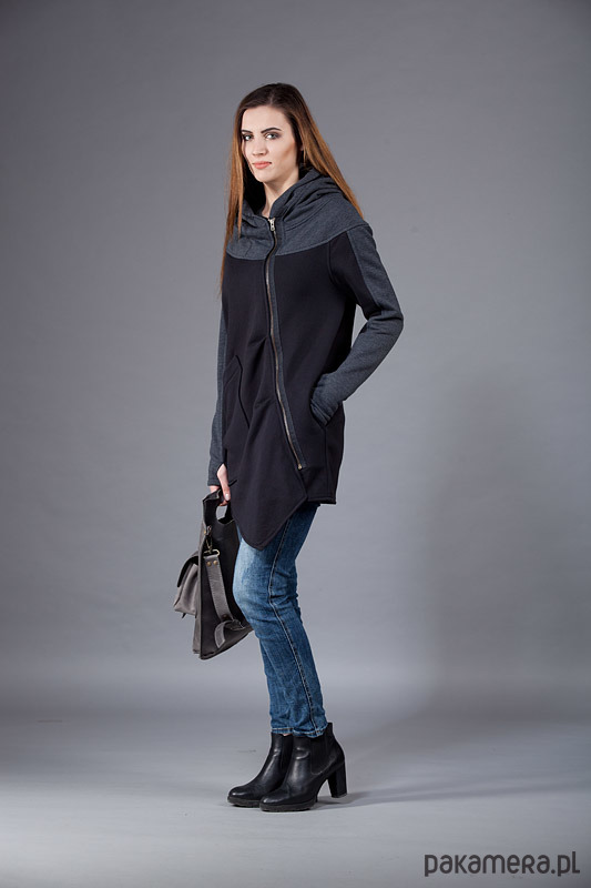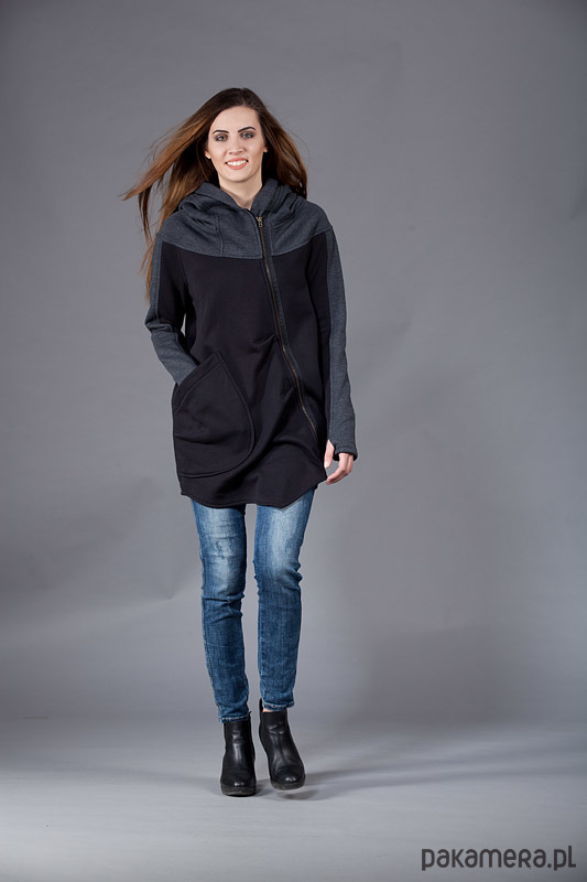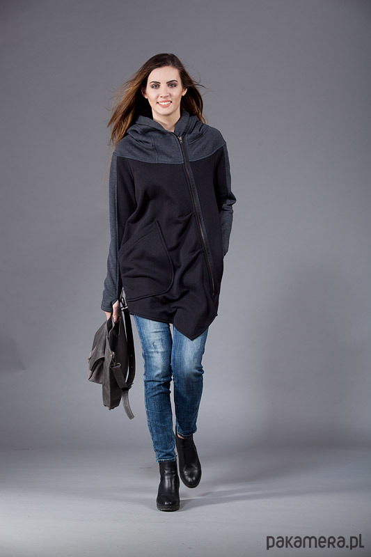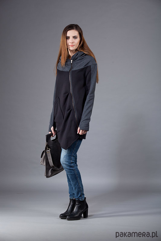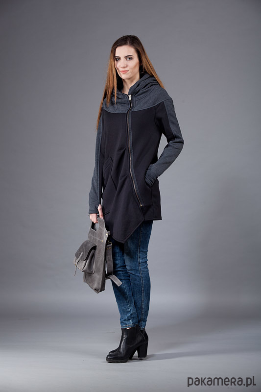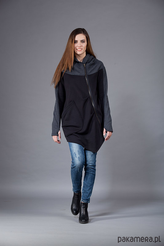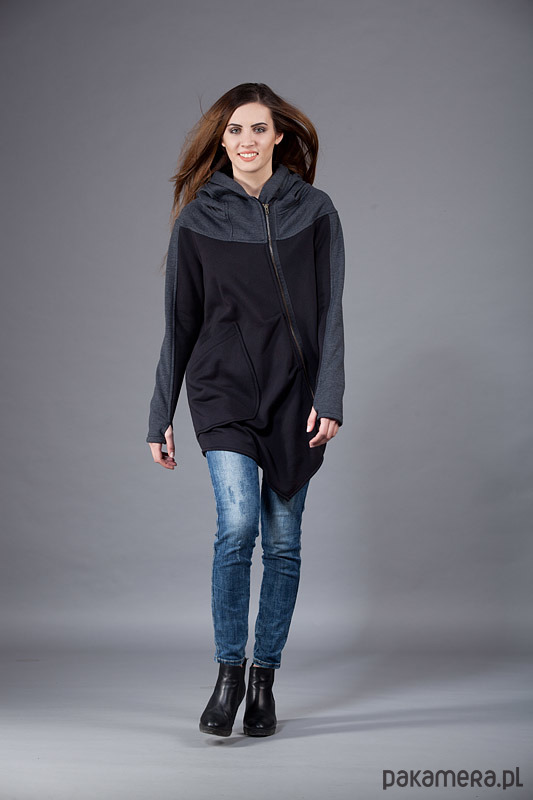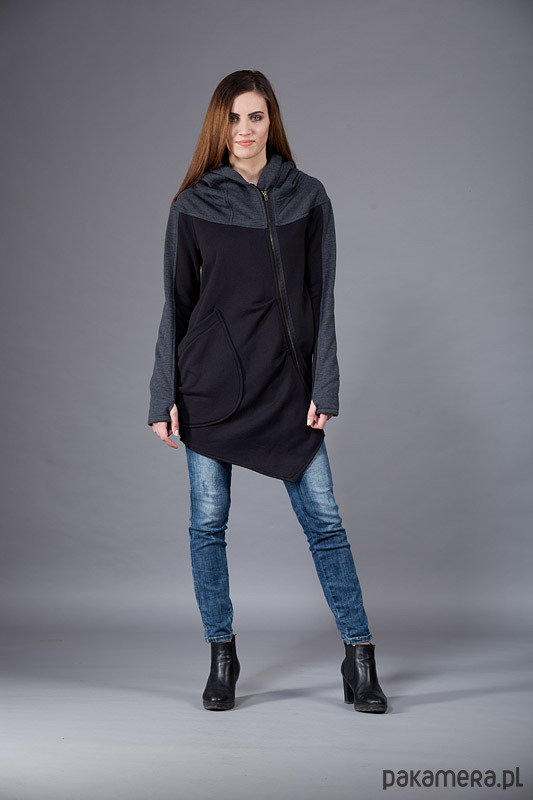 Piękna, wymyślna i bardzo ciepła bluza dresowa, wykonana z wysokiej jakości dzianiny bawełnianej. Posiada kaptur i dwie kieszenie , jedna zewnętrzna a druga wewnętrzna, rękawy długie zakończone otworem na kciuk. Najnowszy, nietypowy fason!