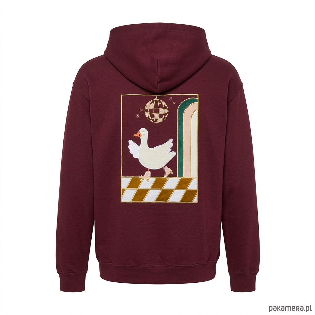 Wysokiej jakości bluza z kapturem, wyróżniająca się unikalnym, autorskim zdobieniem na plecach. Zamiast standardowego nadruku zastosowaliśmy technikę łączącą precyzyjny haft komputerowy ze wstawkami z miękkiego weluru, co nadaje grafice wyjątkową fakturę i trwałość.