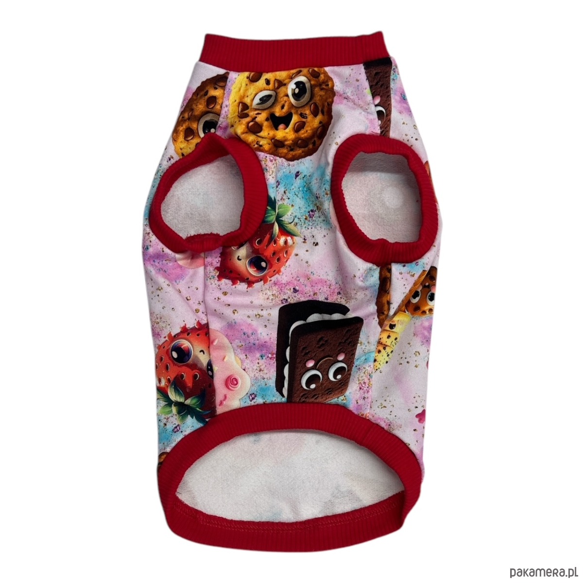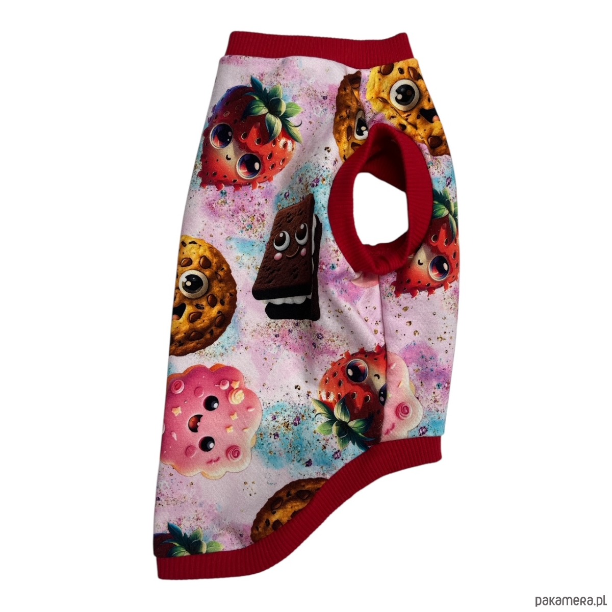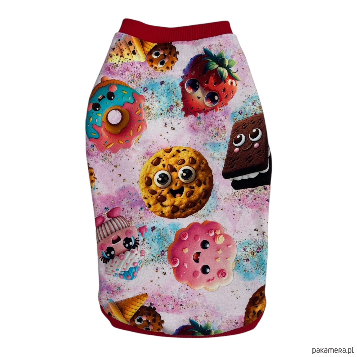 Zapewnij swojemu pupilowi nie tylko ciepło, ale także niepowtarzalny styl dzięki tej kolorowej bluzie z wesołymi wzorami przedstawiającymi truskawki, ciasteczka i inne słodkie desery z uroczymi oczkami. Idealna na chłodne dni i spacery pełne radości!