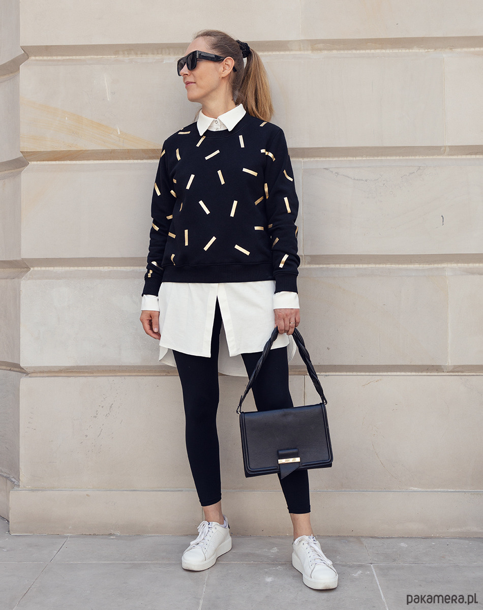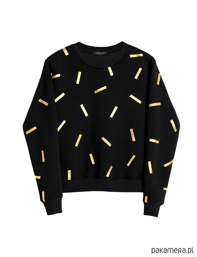 Bluza ze "złotą posypką", uszyta z grubej a zarazem super miękkiej i przyjemnej w dotyku wysokogatunkowej dzianiny bawełnianej w kolorze czarnym. Bardzo ciepła i wygodna. "Złota posypka" wykonana w technice sublimacji, z folii flex wygrzewanej na gorąco bezpośrednio na dzianinie. Nie jest to zwykły nadruk, ale ręcznie wykonywane zdobienia dające bardzo trwały efekt, który nigdy nie wyblaknie ;) Print czyni ją zupełnie wyjątkową i oryginalną sprawiając jednocześnie, że nie jest to zwykła bluza dresowa. Dzięki temu można ją nosić do eleganckich spodni, spódnic, szpilek tworząc tym samym niebanalne, nowoczesne stylizacje :) Dekolt bluzy, dół i rękawy wykończone bawełnianym ściągaczem. dzianina posiada certyfikat oeko-tex. Od spodu dzianina z meszkiem