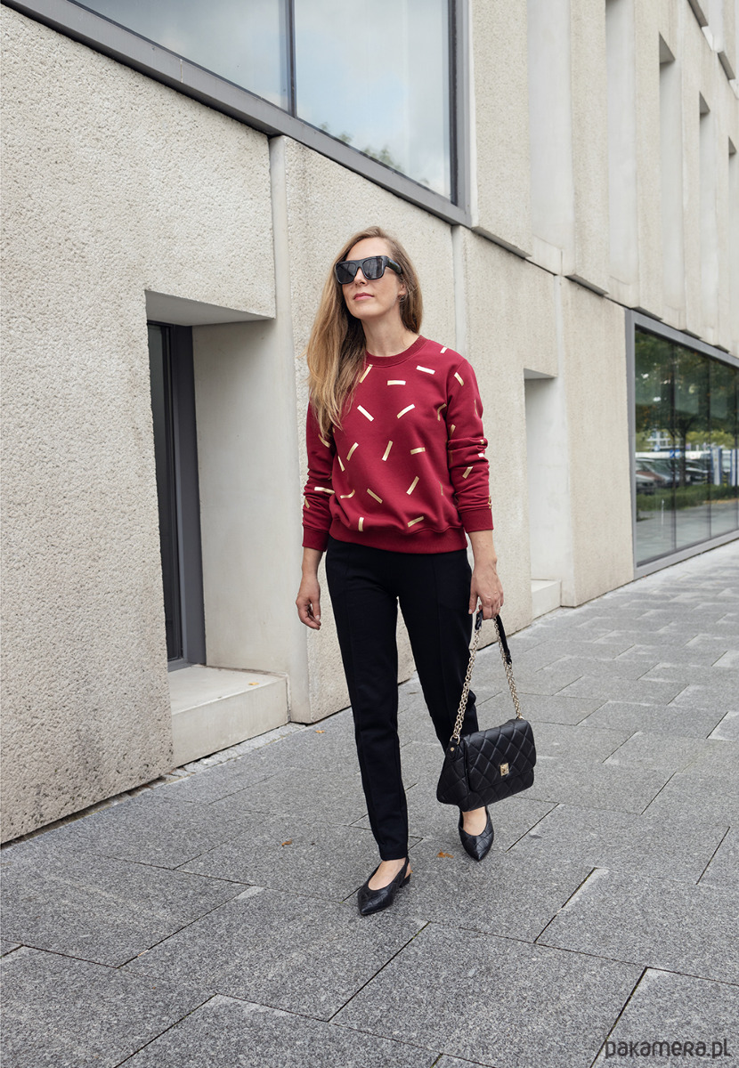 Bluza ze złotą aplikacjąkonfetti. Uszyta z grubej a zarazem super miękkiej i przyjemnej w dotyku wysokogatunkowej dzianiny bawełnianej certyfikowanej znakiem OEKO-TEX. Kolor bordo. Bardzo ciepła i wygodna. Złota aplikacja wykonana w technice sublimacji, z folii flex wygrzewanej na gorąco bezpośrednio na dzianinie. Nie jest to zwykły nadruk, ale ręcznie wykonywane zdobienia dające bardzo trwały efekt, który nigdy nie wyblaknie ;) Jakość dzianiny wraz ze złotą aplikacja czyni ją zupełnie wyjątkową i oryginalną sprawiając jednocześnie, że nie jest to zwykła bluza dresowa. Dzięki temu można ją nosić do eleganckich spodni, spódnic, szpilek tworząc tym samym niebanalne, nowoczesne stylizacje w klimacie luźnej elegancji :) Dekolt bluzy, dół i rękawy wykończone bawełnianym ściągaczem.