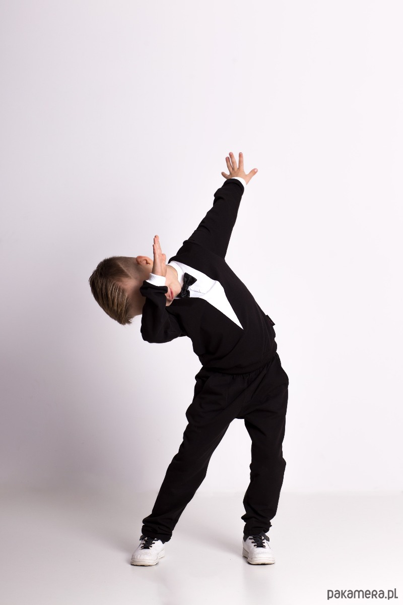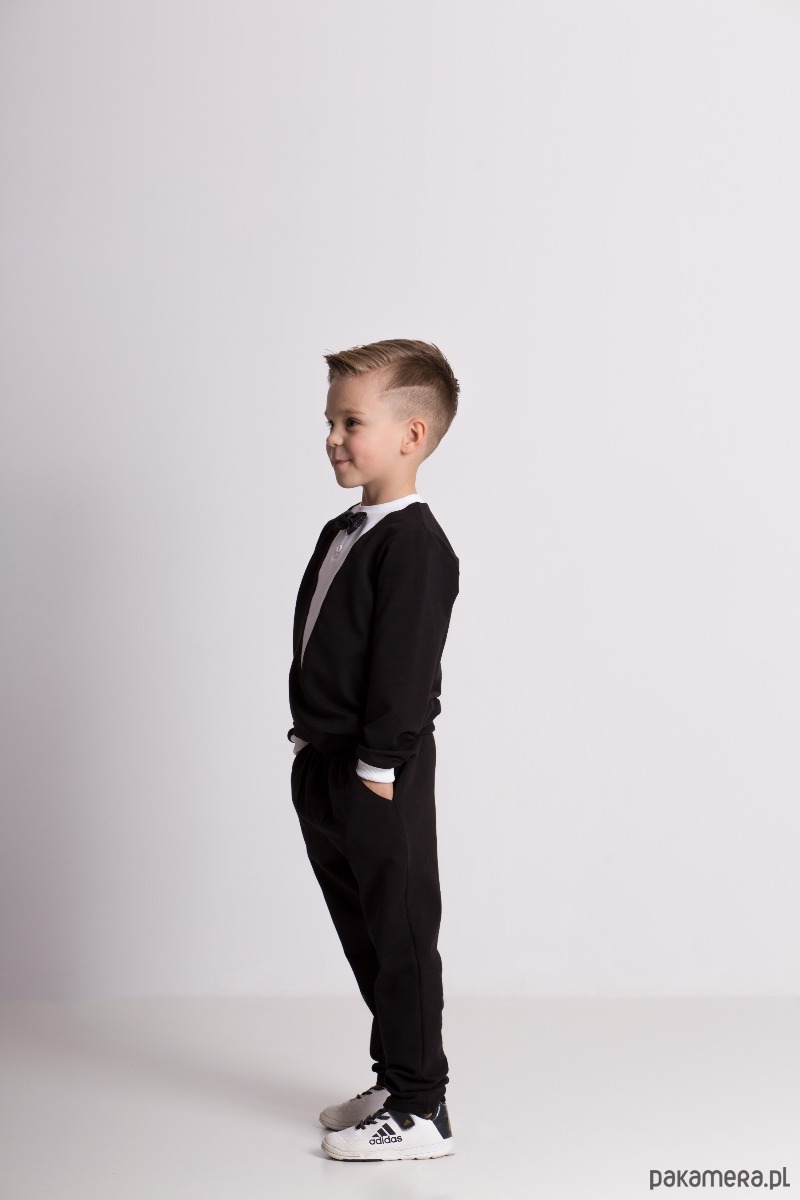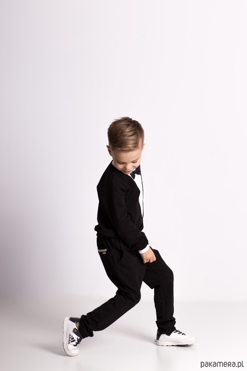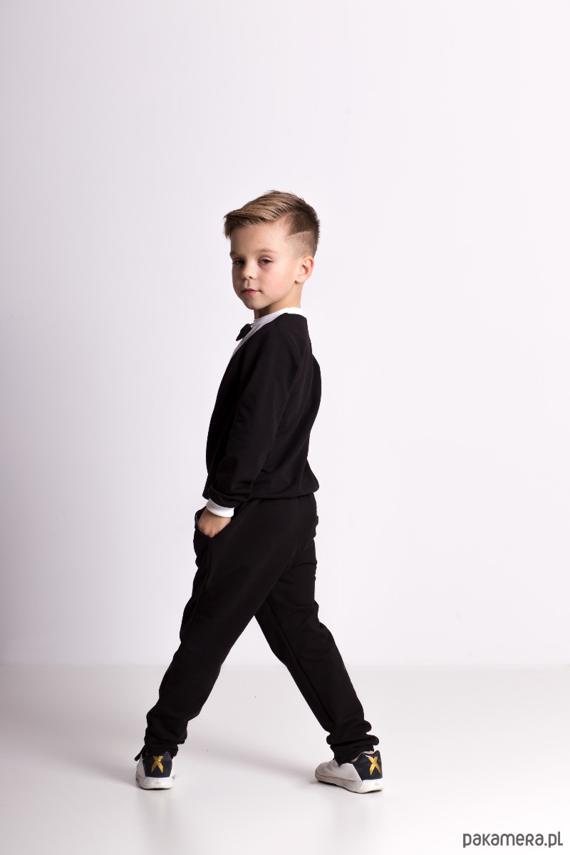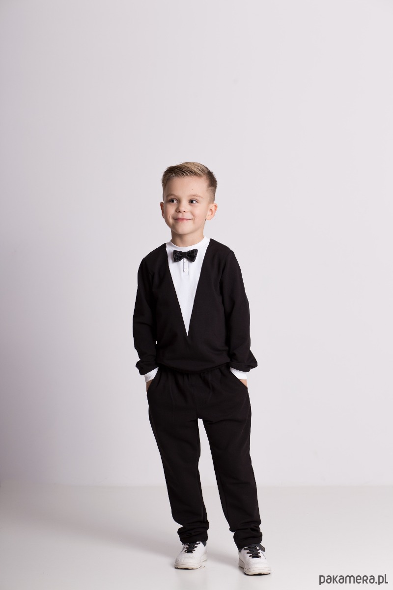 Bluza wykonana z wysokogatunkowej dzianiny dresowej z elastanem. Biała wstawka imituje wychodzącą koszulę, a mucha wykonana z ażurowej ekoskóry dodaje całości niesamowitej elegancji. Bluza wykończona jest przy szyi ściągaczem dzięki czemu jest bardzo wygodna i łatwo się ją zakłada:) Cały zestaw stanowi świetną alternatywę dla klasycznych sztywnych garniturów. Polecamy serdecznie:)