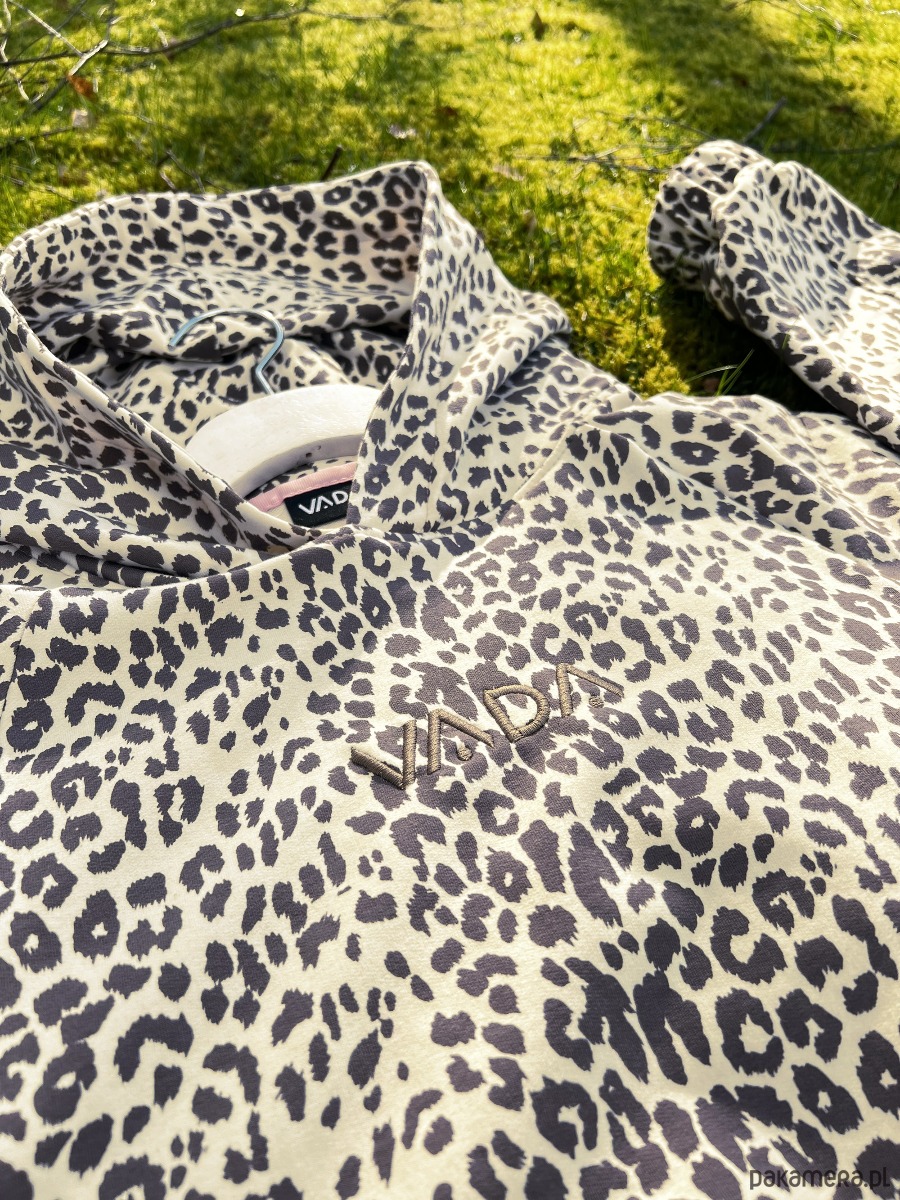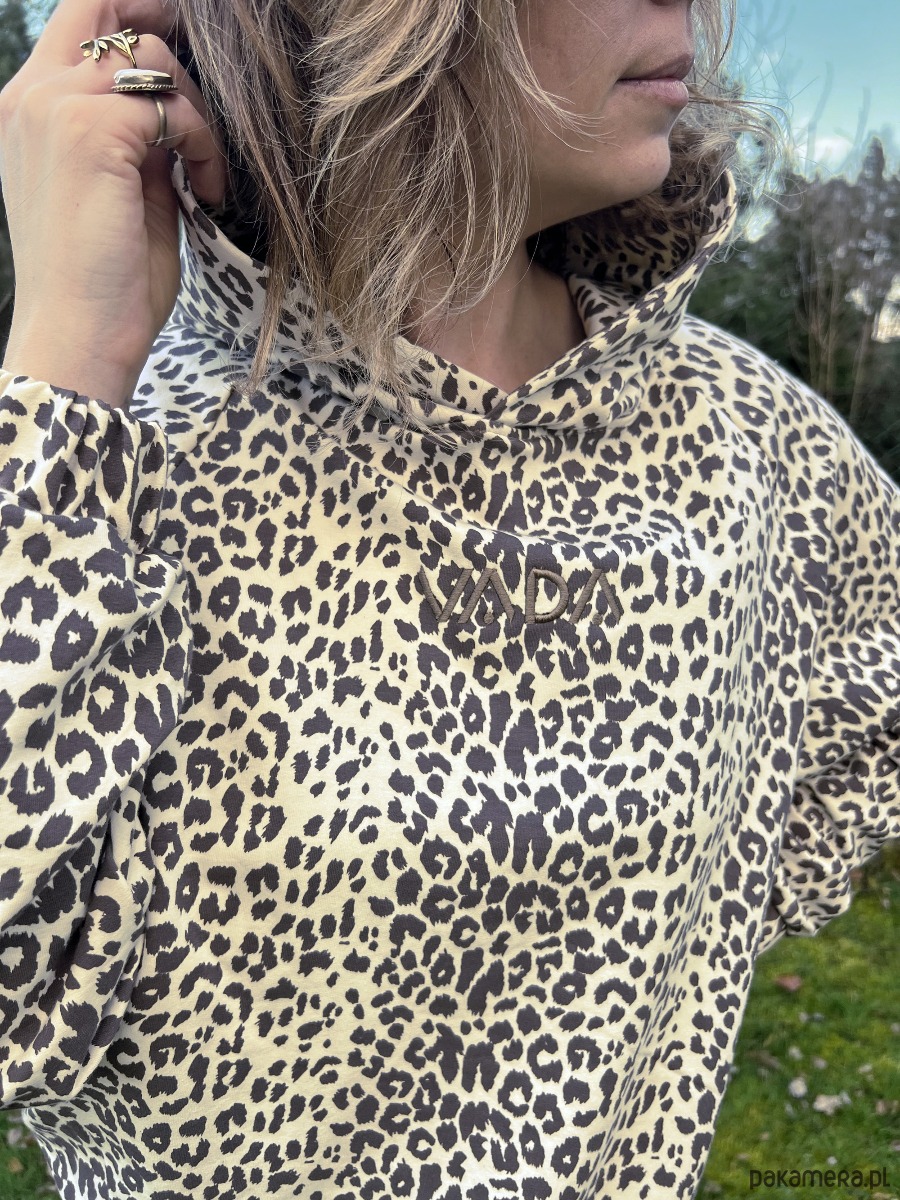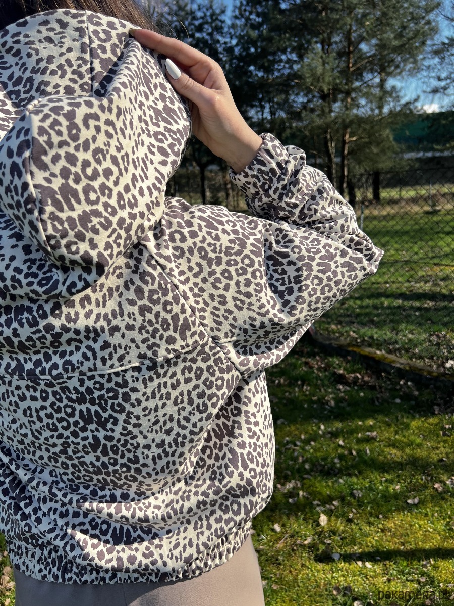 Bluza damska z mięsistej dresówki w ciemno brązowe cętki na śmietankowym tle. Modny zwierzęcy wzór w cętki doda oryginalności Twojej stylizacji. Fason z luźnymi długimi rękawami raglan, z dodatkowym przeszyciem - stebnowaniem. Bluza jest funkcjonalna orasz komfortowa w użytkowaniu. Elastyczna guma w pasie jak i na rękawach zapewnia dobre dopasowanie jak i wygodę noszenia.