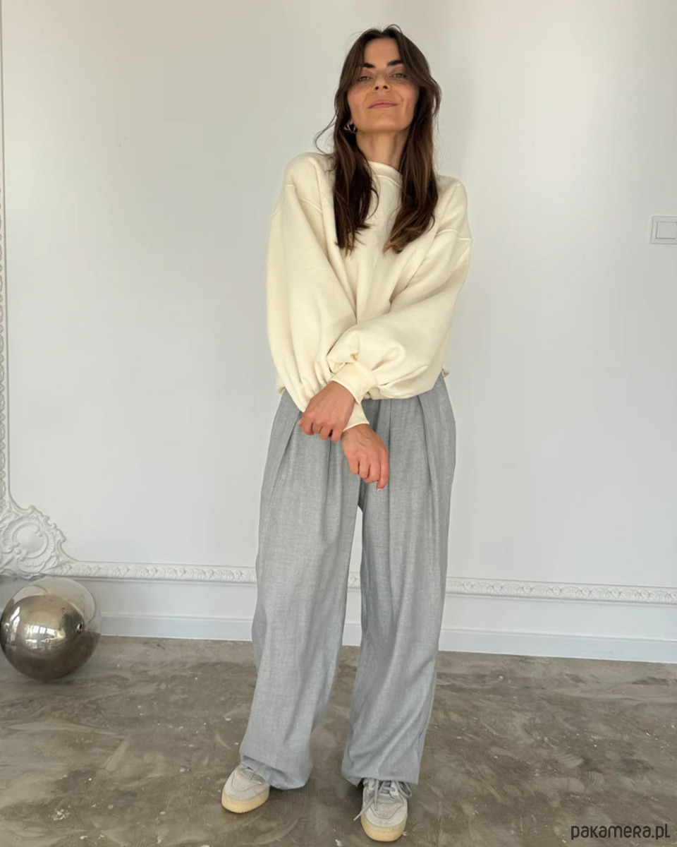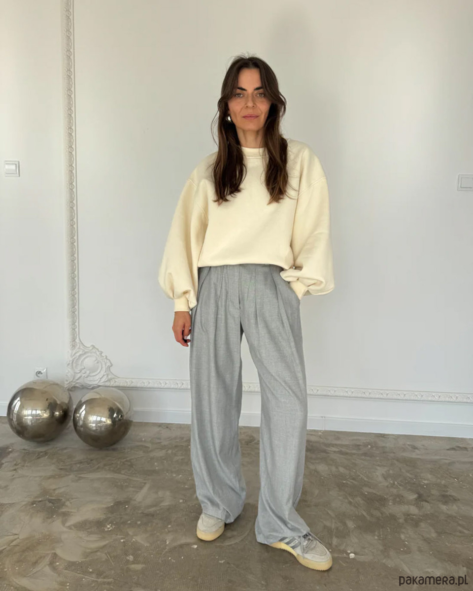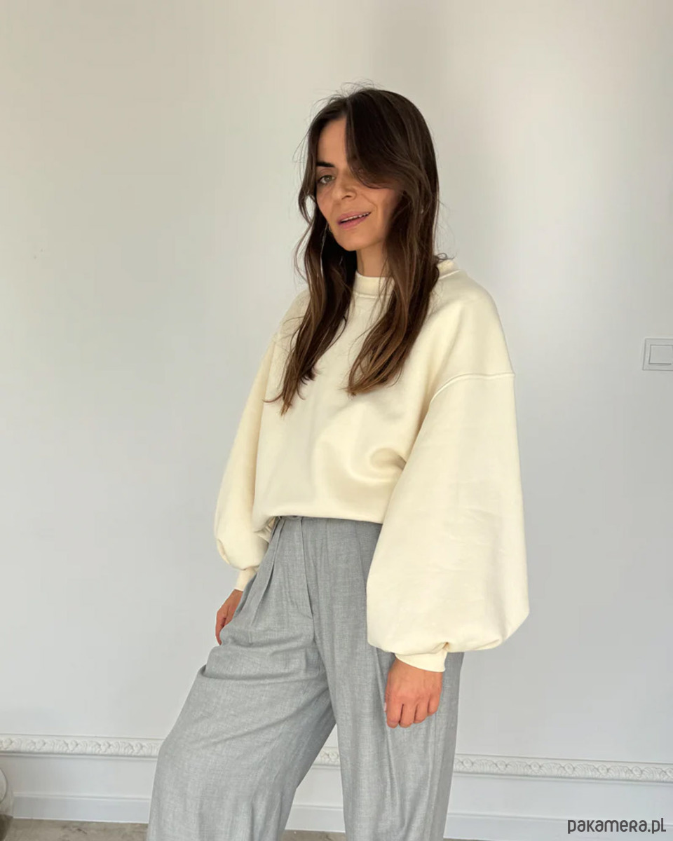 Jej oversize’owy krój z charakterystycznymi bufiastymi rękawami i szerokimi ściągaczami nadaje sylwetce nowoczesny, kobiecy kształt. Odcień antique ecru – delikatny, ciepły ton z nutą kremu – tworzy idealną bazę dla kapsułowej garderoby. Świetnie komponuje się z beżami, brązami, czernią i szałwią, dodając stylizacjom miękkości i spokoju.