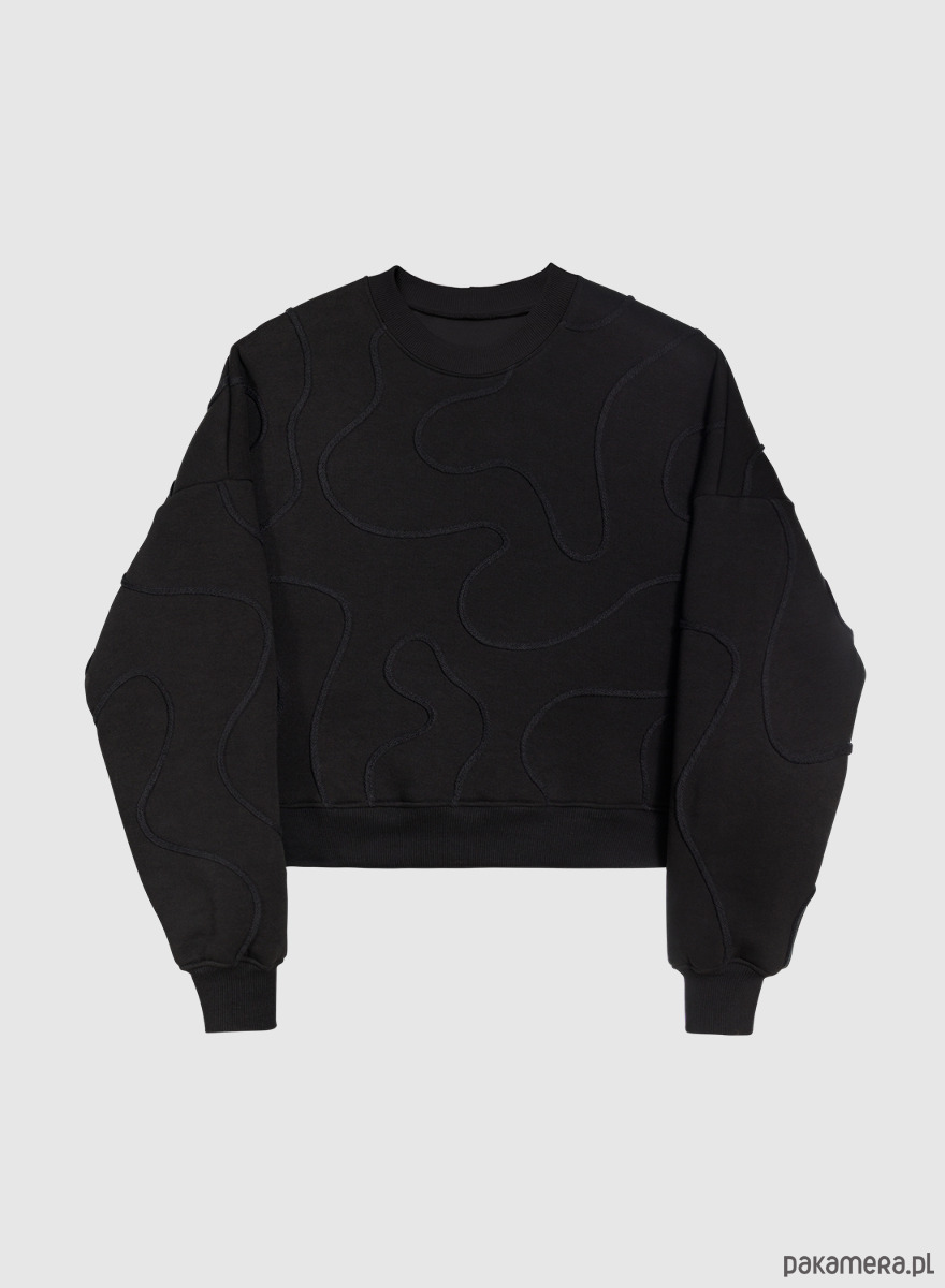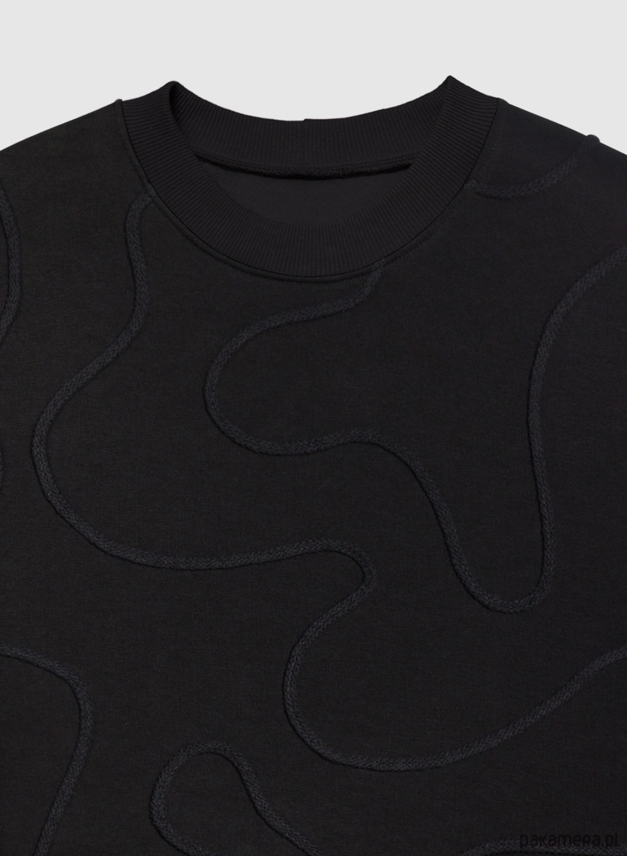 Jedyna w swoim rodzaju bluza dresowa w kolorze czarnym z ręcznie przyszywanym dekoracyjnym wzorem z bawełnianego sznurka. Uszyta z super miękkiej i przyjemnej w dotyku wysokogatunkowej dzianiny bawełnianej, certyfikowanej znakiem OEKO-TEX, co oznacza, że jest bezpieczna dla Twojej skóry i środowiska. Nie mechaci się, nie wyciąga się, nie wypycha np. na łokciach, a kolor nie blaknie. Bardzo wygodna. Rękawy, dekolt i dół wykończone bawełnianym ściągaczem.