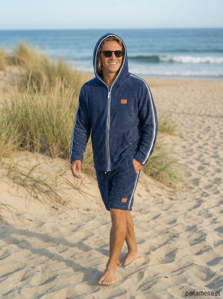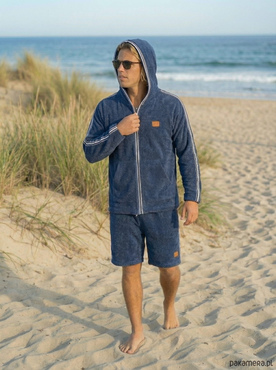 Navy Blue - granatowa męska bluza z kapturem wykonana jest z miękkiej bawełnianej frotte (400 g/m²) która zapewni Ci ciepło, wygodę i swobodę ruchów po pływaniu, surfingu lub dniu na plaży. Pętelkowy materiał jest miękki w dotyku, oddychający, chłonny i naturalnie wygodny. Bluza z kapturem ma zamek błyskawiczny na całej długości, wygodny kaptur i dwie przednie kieszenie, które zapewniają wygodę na co dzień. Subtelne lampasy boczne na rękawach nadają jej sportowy wygląd, a kontrastowe wykończenie wokół zamka i kaptura, świeży i atrakcyjny wygląd.