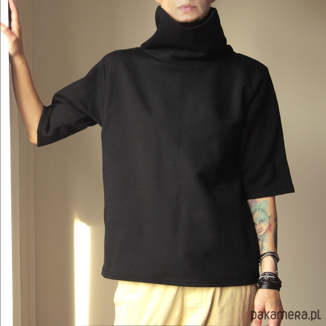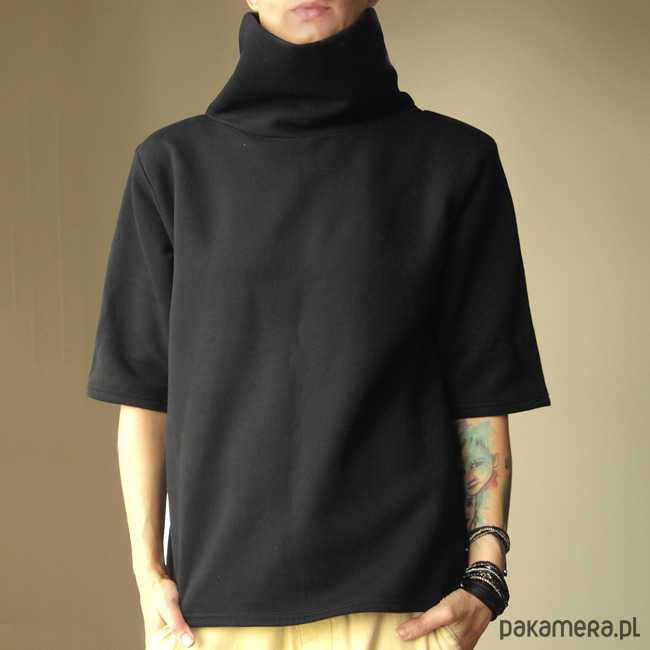 Klasyczna czarna bluza z twistem: duży golf i rękaw do łokcia w oversize’owym kroju.