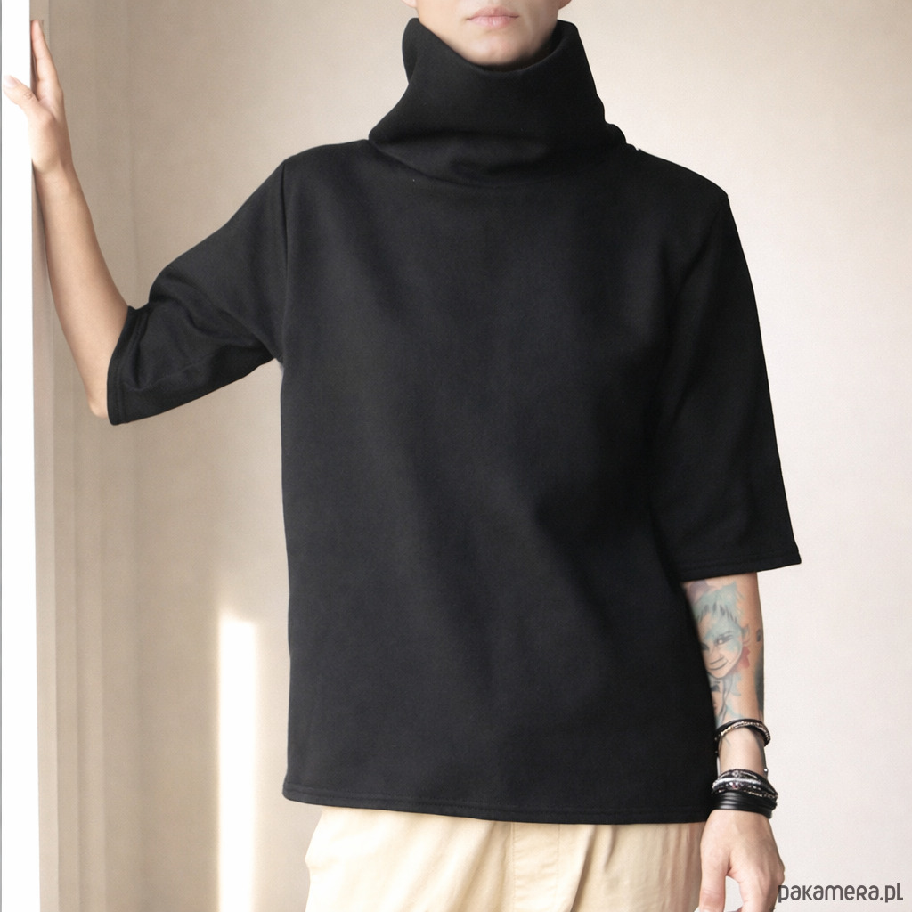 Klasyczna czarna bluza z twistem: duży golf i rękaw do łokcia w oversize’owym kroju.