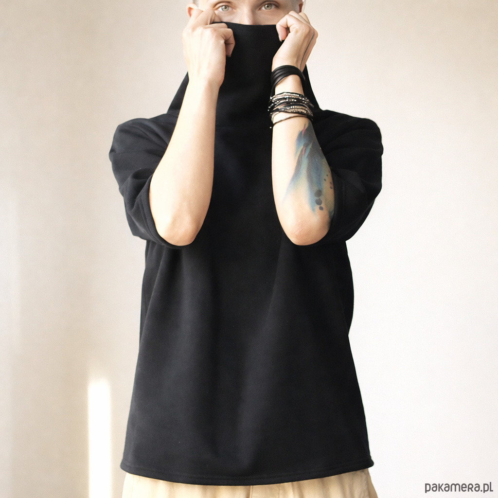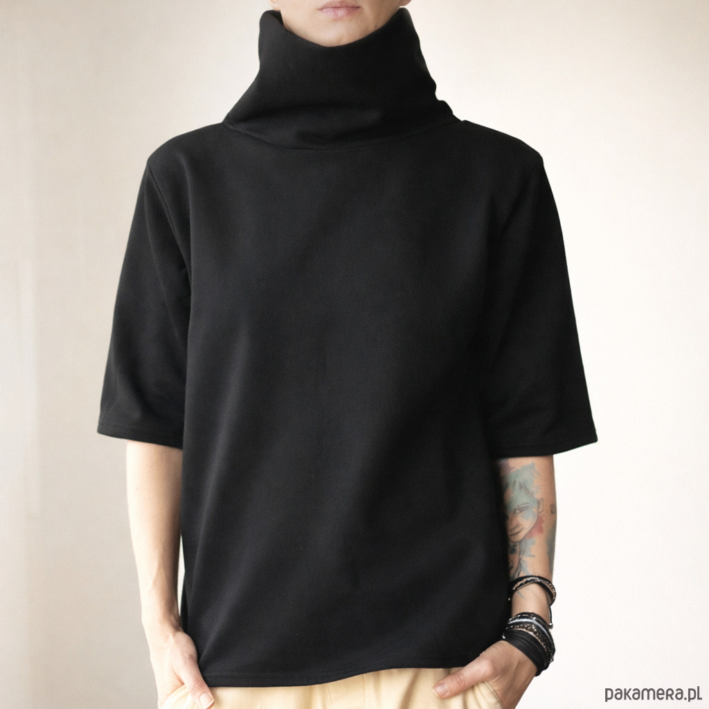 Klasyczna czarna bluza z twistem: duży golf i rękaw do łokcia w oversize’owym kroju.