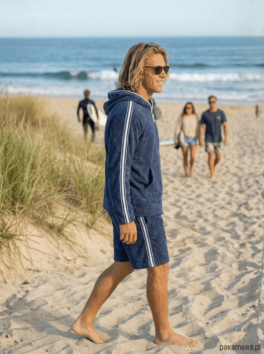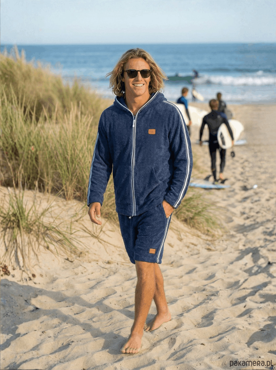 Komplet Navy Blue - granatowa męska bluza z kapturem i szorty, wykonane z miękkiej bawełnianej frotte (400 g/m²) która zapewni Ci ciepło, wygodę i swobodę ruchów po pływaniu, surfingu lub dniu na plaży. Pętelkowy materiał jest miękki w dotyku, oddychający, chłonny i naturalnie wygodny. Bluza z kapturem ma zamek błyskawiczny na całej długości, wygodny kaptur i dwie przednie kieszenie, które zapewniają wygodę na co dzień. Subtelne lampasy boczne na rękawach nadają jej sportowy wygląd, a kontrastowe wykończenie wokół zamka i kaptura, świeży i atrakcyjny wygląd.
