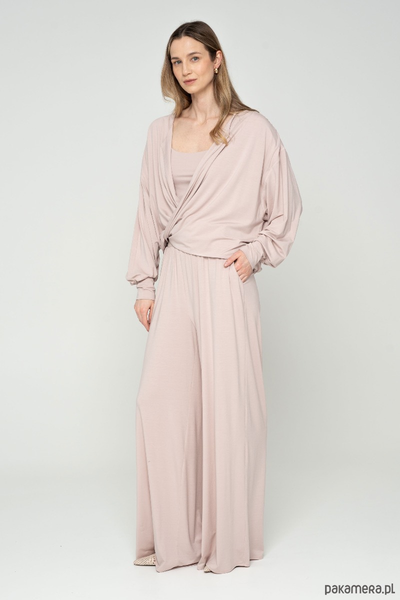Bluza z kopertowym założeniem. Uszyta z dwóch warstw modalowej dzianiny. Rękawy szerokie wykończone mankietami. Na bokach guziki do zapięcia koperty.