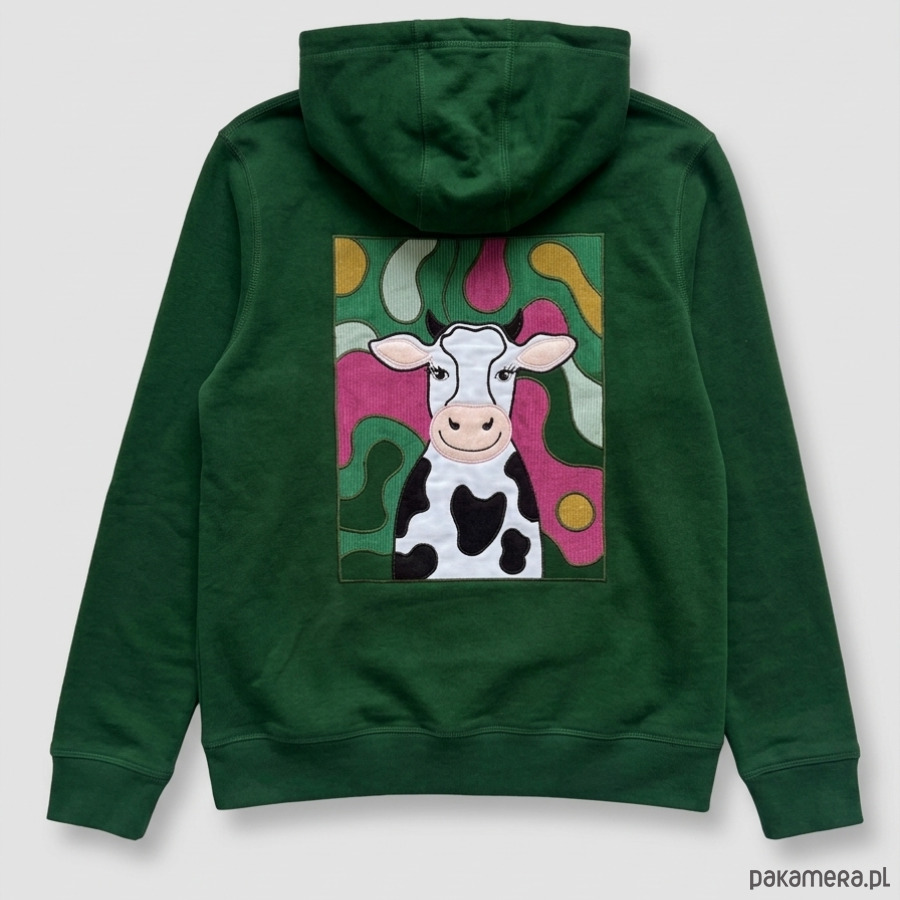 Wysokiej jakości bluza, wyróżniająca się unikalnym, autorskim zdobieniem na plecach. Zamiast standardowego nadruku zastosowaliśmy technikę łączącą precyzyjny haft komputerowy ze wstawkami z miękkiego weluru, co nadaje grafice wyjątkową fakturę i trwałość.