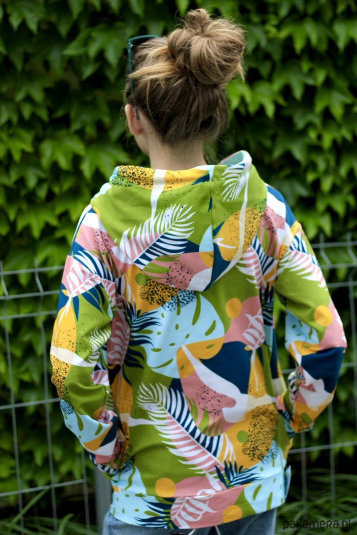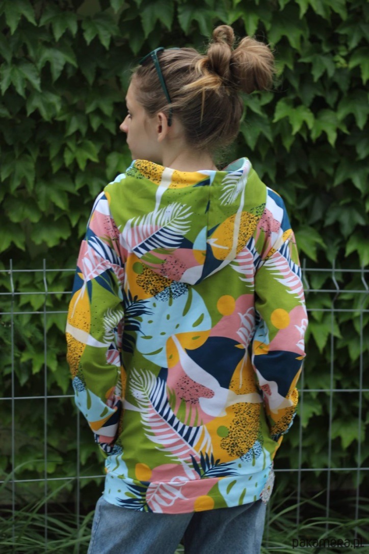 Kolorowa, damska bluza z kapturem, wykonana z dzianiny dresowej pętelki w oryginalnym wzorze letnich, zielonych liści.