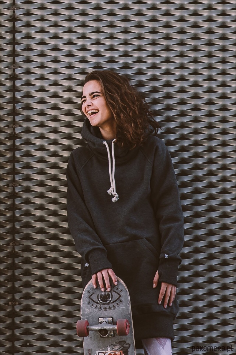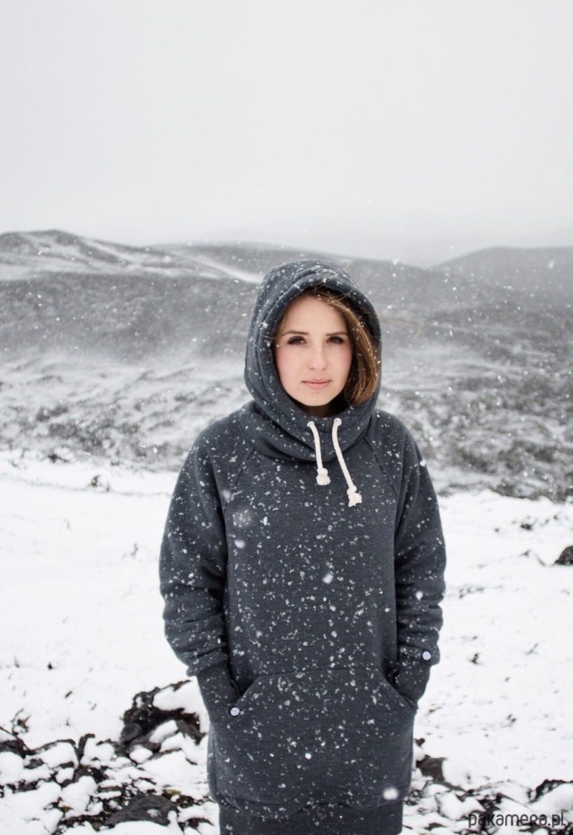 Luzak Grafitowy to ciepła bluza z grubej dresówki bawełnianej w klasycznym, ciemnoszarym kolorze. Luzak ma głęboki kaptur z jasnym, naturalnym sznurkiem. Rękawy i dół bluzy są wykończone szerokim ściągaczem. Dodatkowo mankiety są mają specjalne otwory na kciuki. Z przodu bluza ma dużą kieszeń – kangurek. Luzak Grafitowy jest dłuższy niż klasyczne bluzy, dzięki czemu idealnie nosi się z legginsami. Bluza Luzak jest stworzona dla miłośników komfortu i wygody.