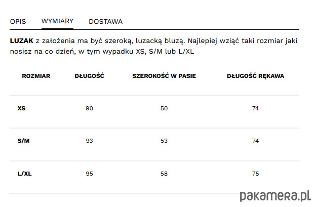 Bluza jest dostępna w trzech rozmiarach – XS, S/M i L/XL