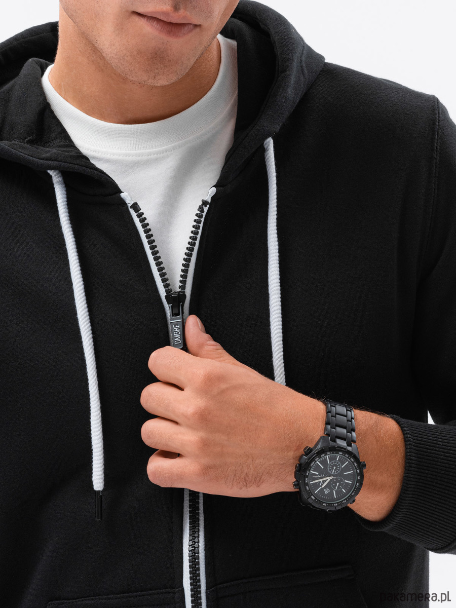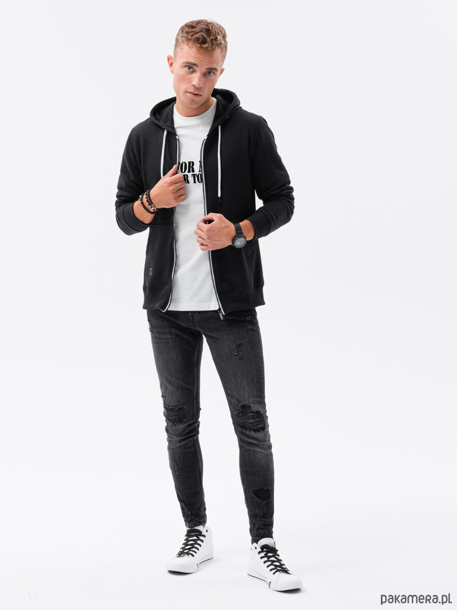 Męska bluza z kapturem zapinana na kontrastujący zamek. Duża kieszeń typu kangurka. Lekko dopasowany krój. Sznurek w kontrastującym kolorze. Jej uniwersalny charakter pozwala na łączenie z wieloma elementami męskiej garderoby