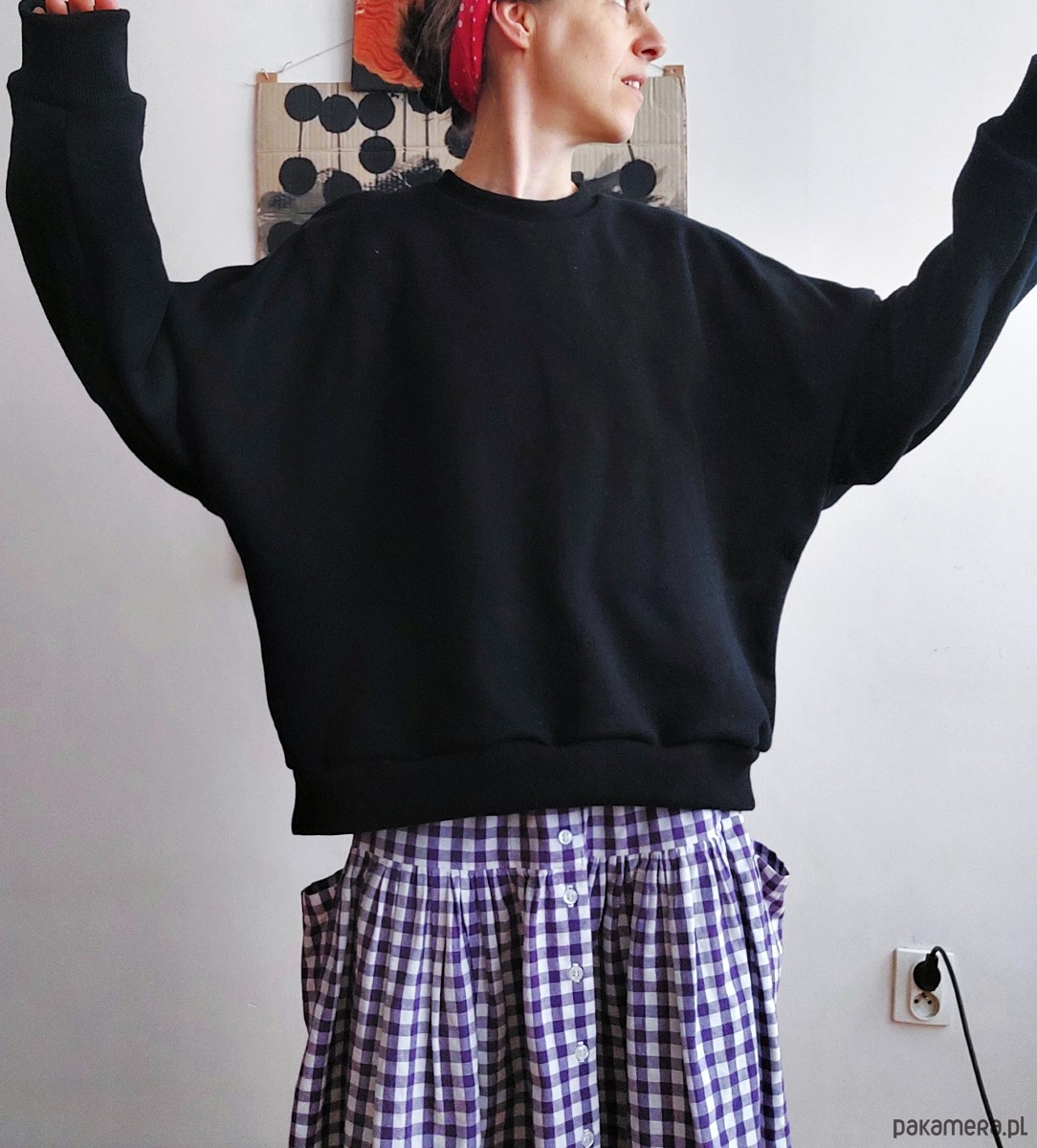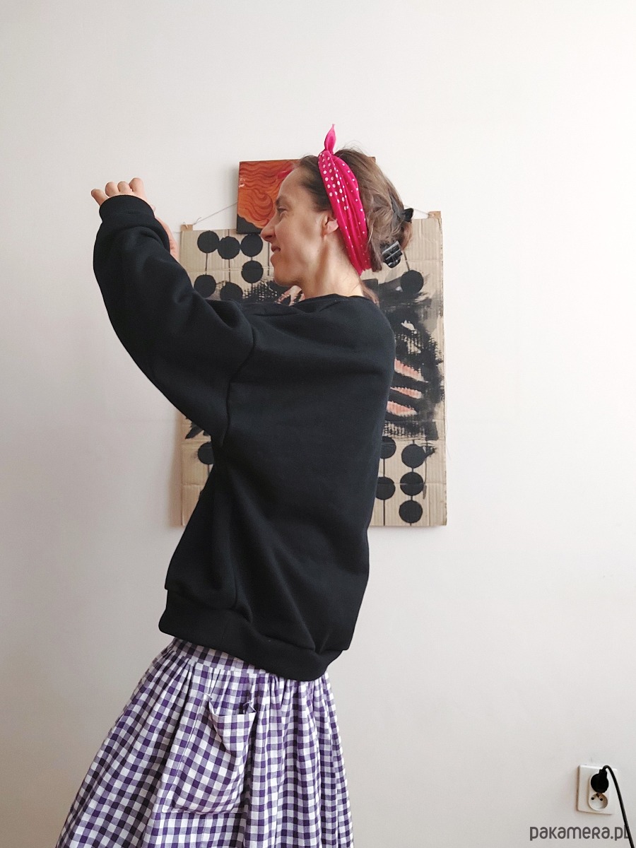 Uszyta w Polsce przez madebyjokpa, rozmiar M, typ oversize, osoba na zdjęciach nosi ciuchy w rozmiarze S, ma na sobie rozmiar M.