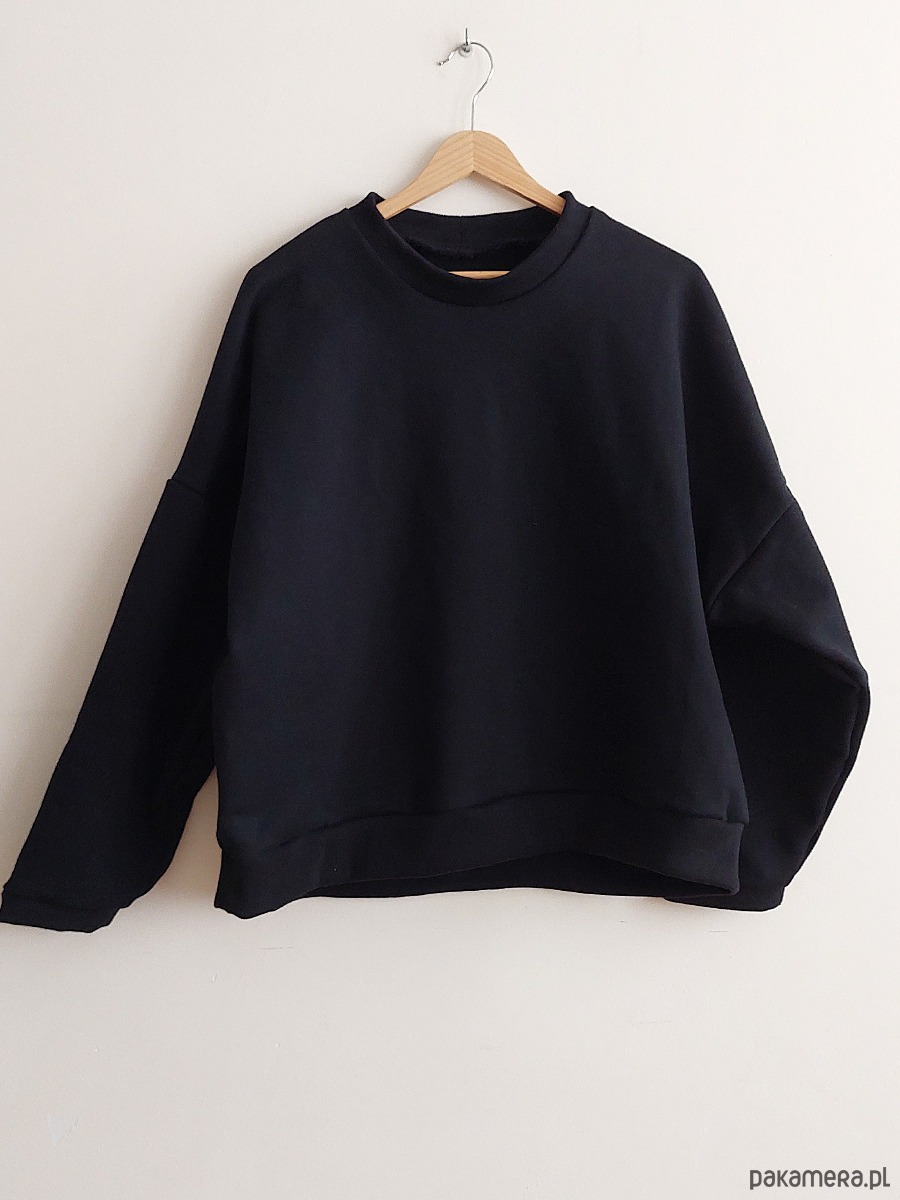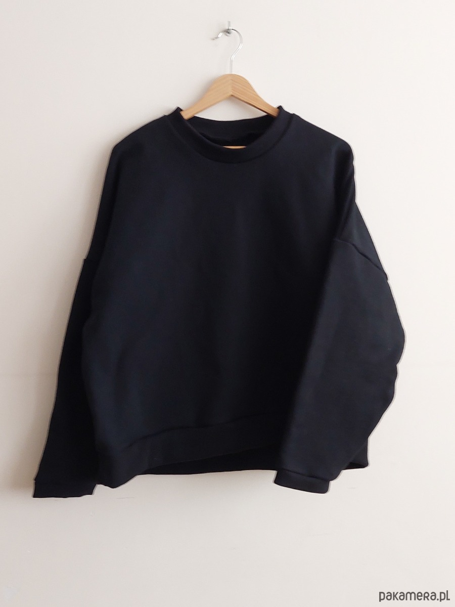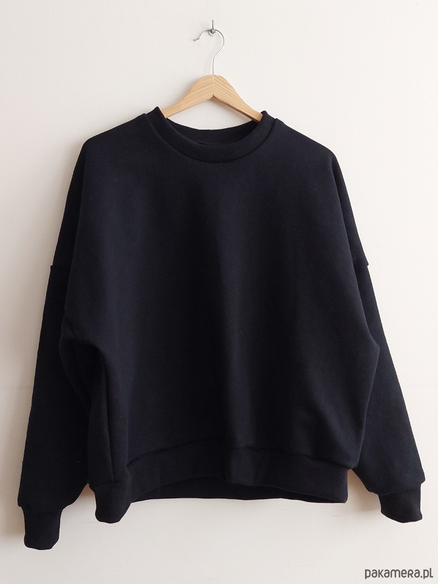 Bluza ma bardzo piękny, czarny kolor, jest wygodna, stylowa, szeroka, typu oversize z dłuższym tyłem.