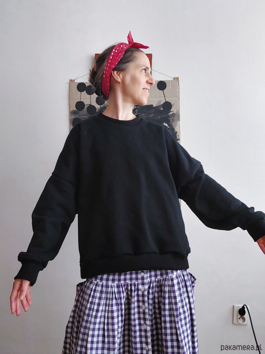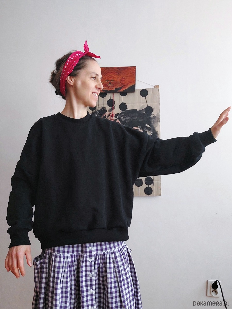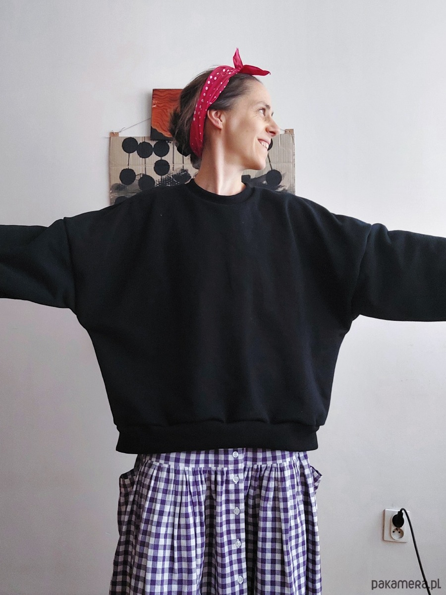 Bluza ma bardzo piękny, czarny kolor, jest wygodna, stylowa, szeroka, typu oversize z dłuższym tyłem.