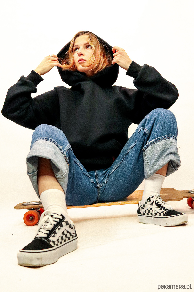 Oversize’owa bluza z kapturem typu baggy. Krój unisex o obniżonej linii ramion i skróconym fasonie. Razem z jeansami, leginsami i spodniami dresowymi z wysokim stanem stanowią zestaw doskonały.