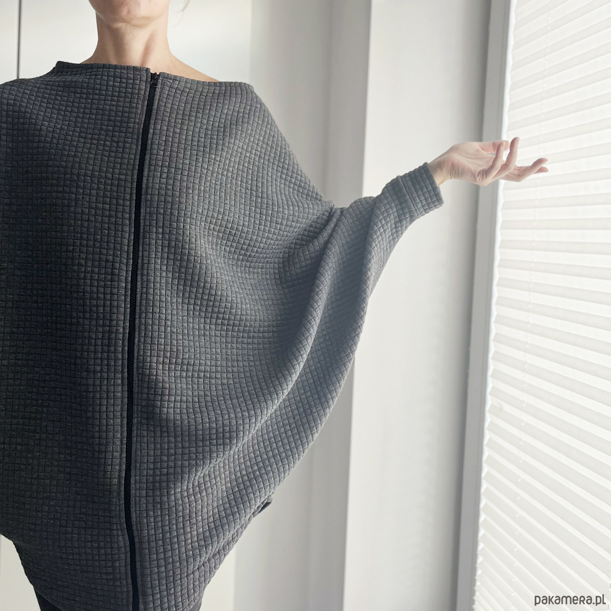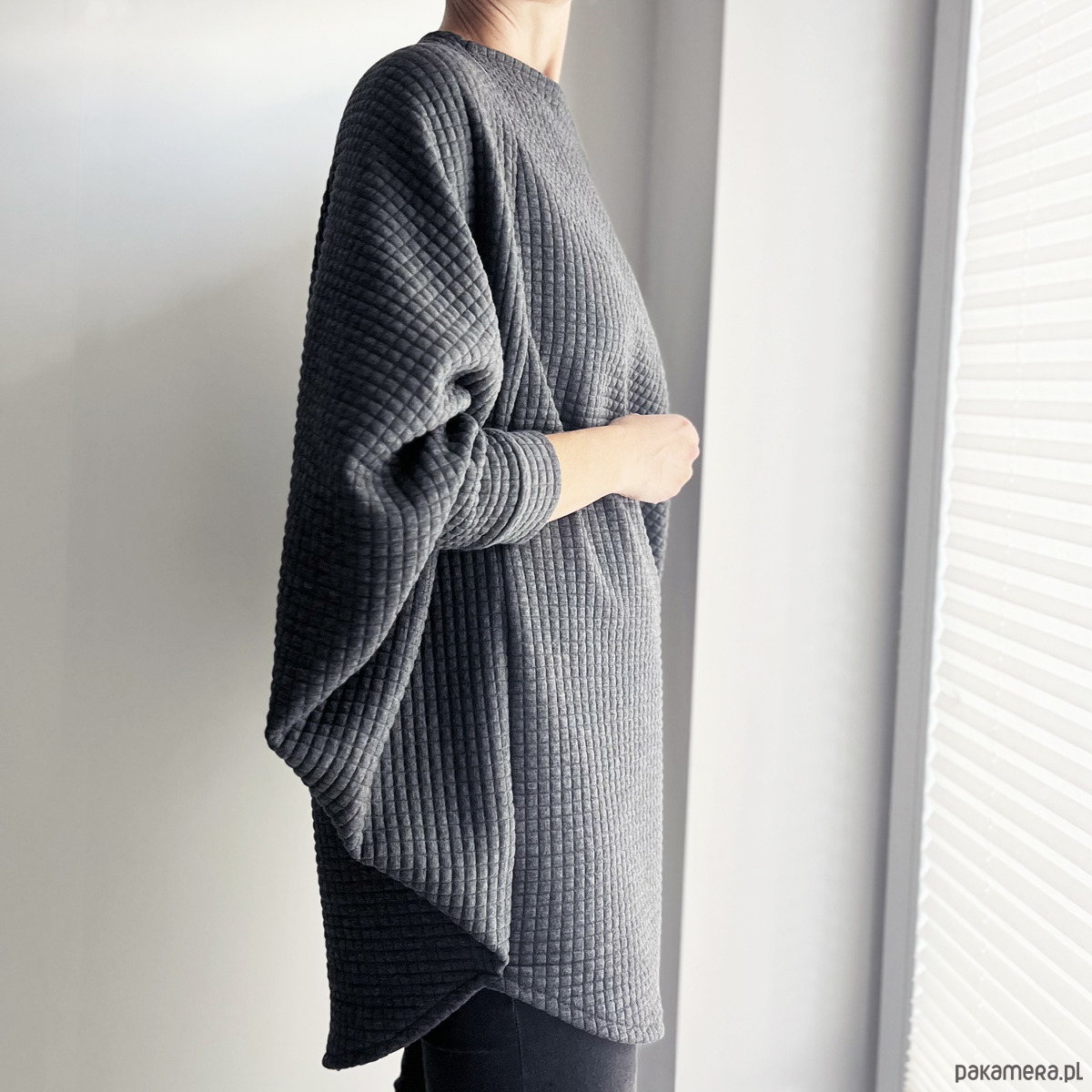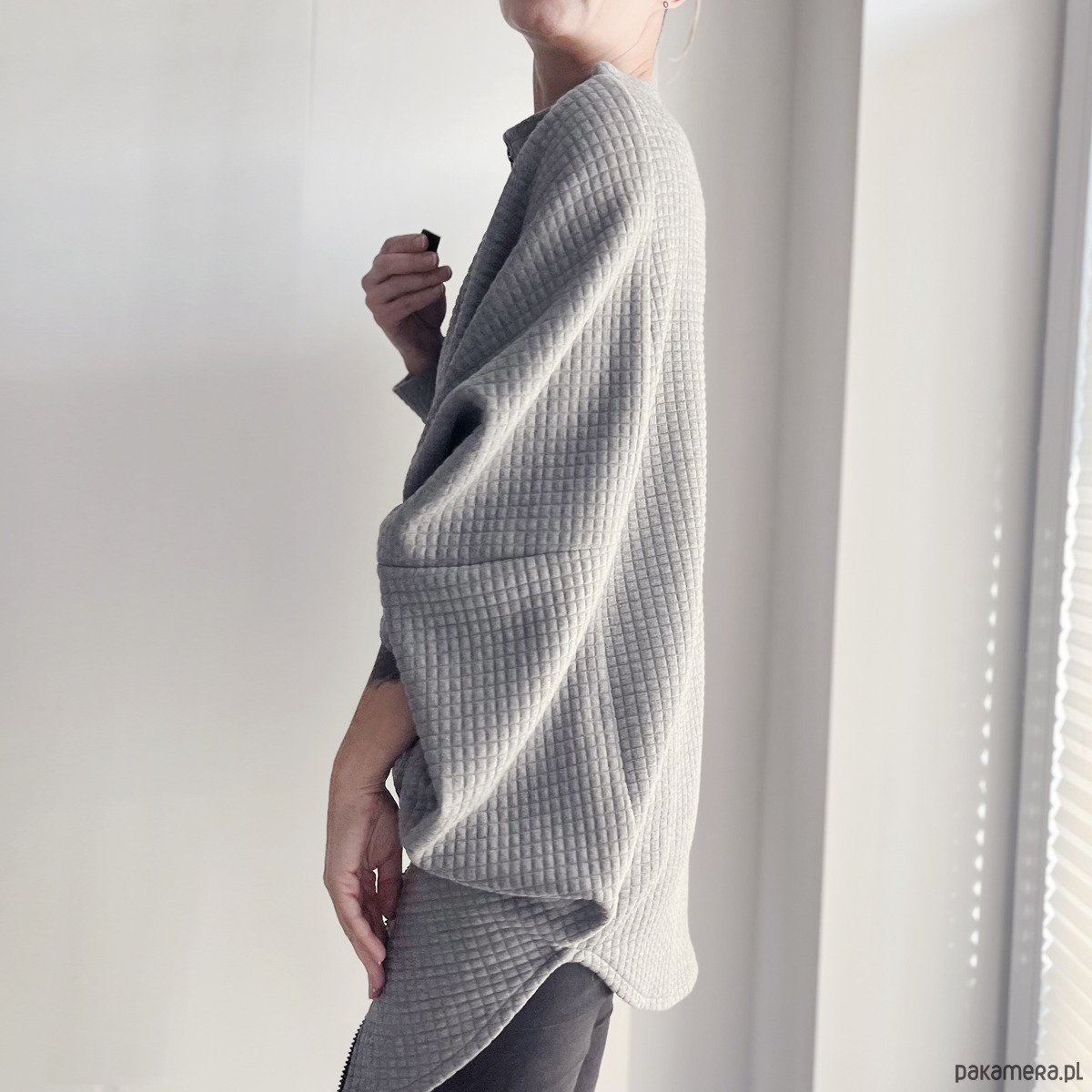 Jasnoszara bluza oversize Nietoperz uszyta z miękkiej, pikowanej dzianiny, która delikatnie trzyma formę i pięknie układa się na sylwetce.