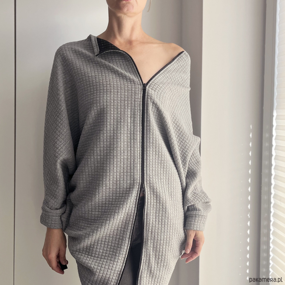 Dzianina ma subtelną fakturę pikowania, która dodaje całości struktury i głębi. Idealna na jesień i zimę – ciepła, a jednocześnie lekka.
