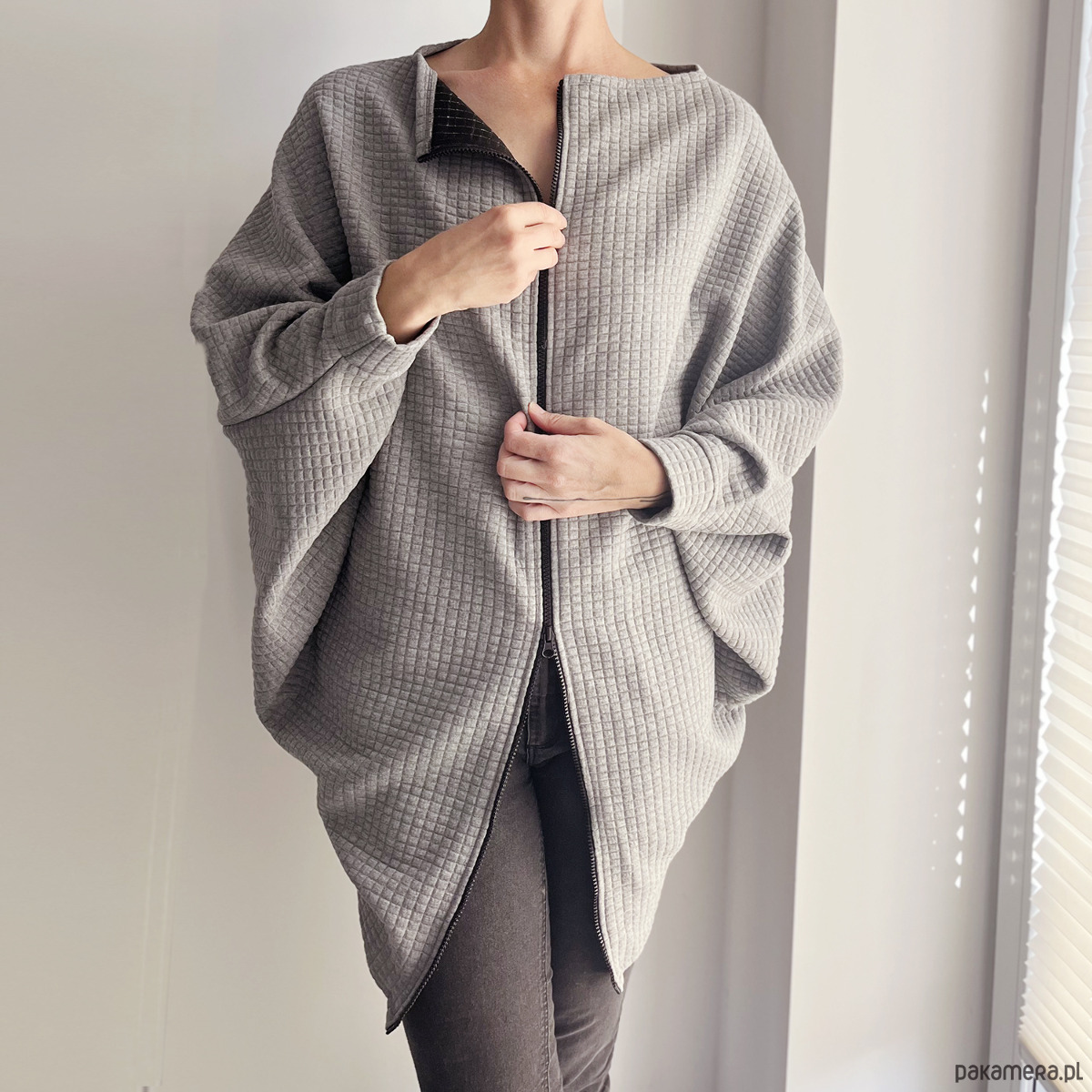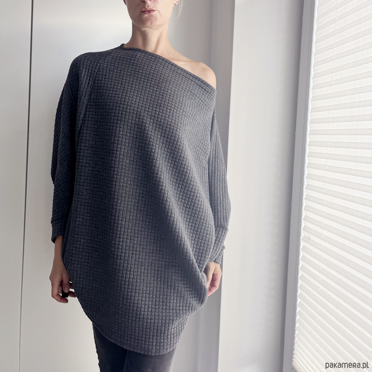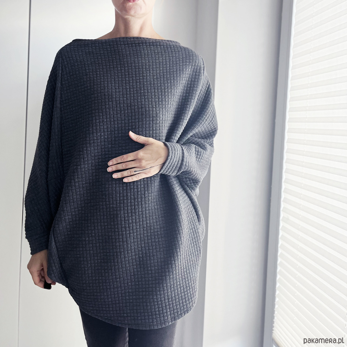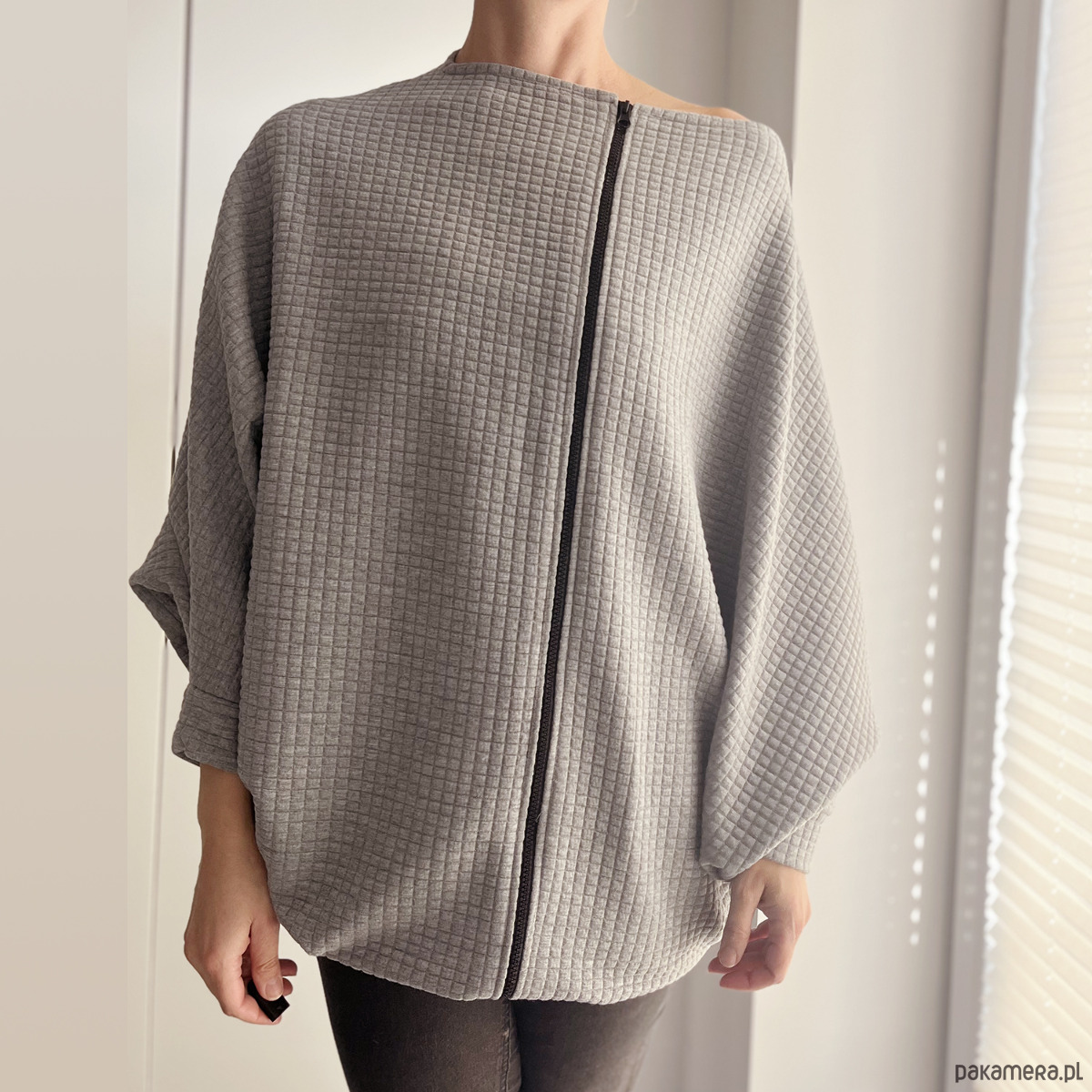 Jasnoszara bluza oversize Nietoperz uszyta z miękkiej, pikowanej dzianiny, która delikatnie trzyma formę i pięknie układa się na sylwetce.