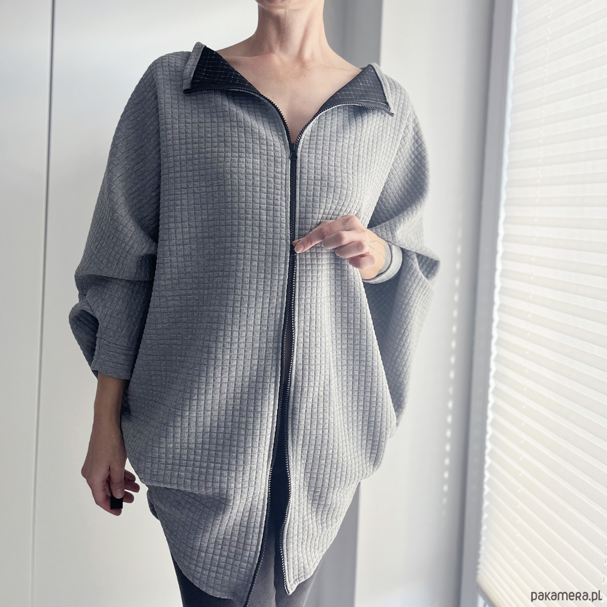 Dwustronny suwak pozwala nosić ją na wiele sposobów: klasycznie, odwróconą tyłem do przodu, rozpiętą lub częściowo zapiętą – w zależności od nastroju i stylizacji.