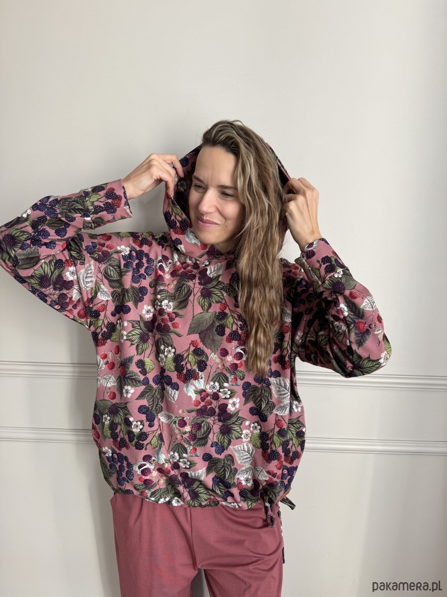 Bluza oversize z kapturem JEŻYNY. Ma styl luźny i swobodny. Wykonana jest z wysokiej jakości materiału dresowego z nadrukiem cyfrowym w nasz autorki wzór. Bluza jest w jednym rozmiarze mocno oversize. Rękawy wykończone ściągaczem w kolorze materiału na dole bluza ma wciągnięty sznurek, którym można nadać jej kształt.
