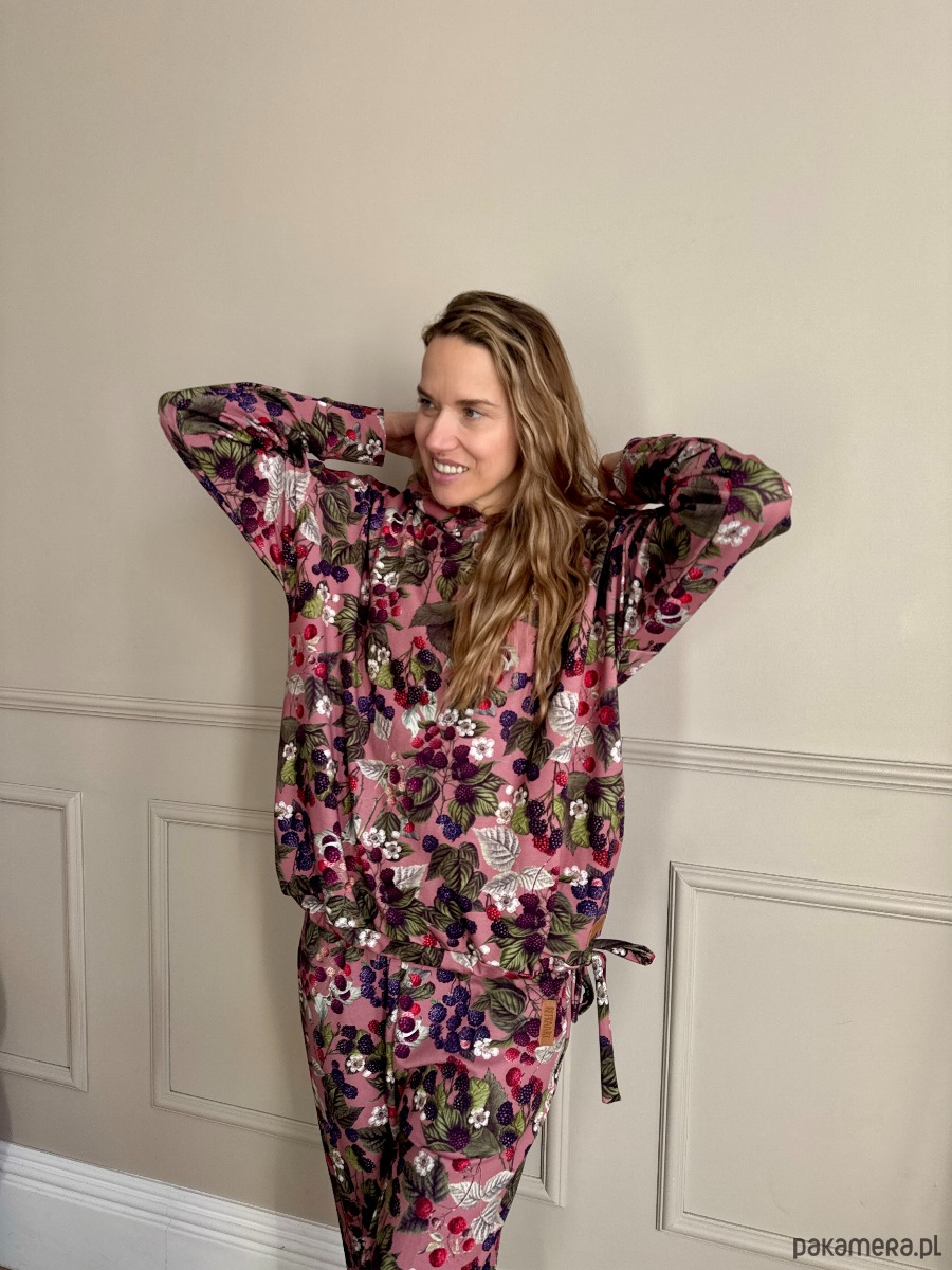 Bluza oversize z kapturem JEŻYNY. Ma styl luźny i swobodny. Wykonana jest z wysokiej jakości materiału dresowego z nadrukiem cyfrowym w nasz autorki wzór. Bluza jest w jednym rozmiarze mocno oversize. Rękawy wykończone ściągaczem w kolorze materiału na dole bluza ma wciągnięty sznurek, którym można nadać jej kształt.