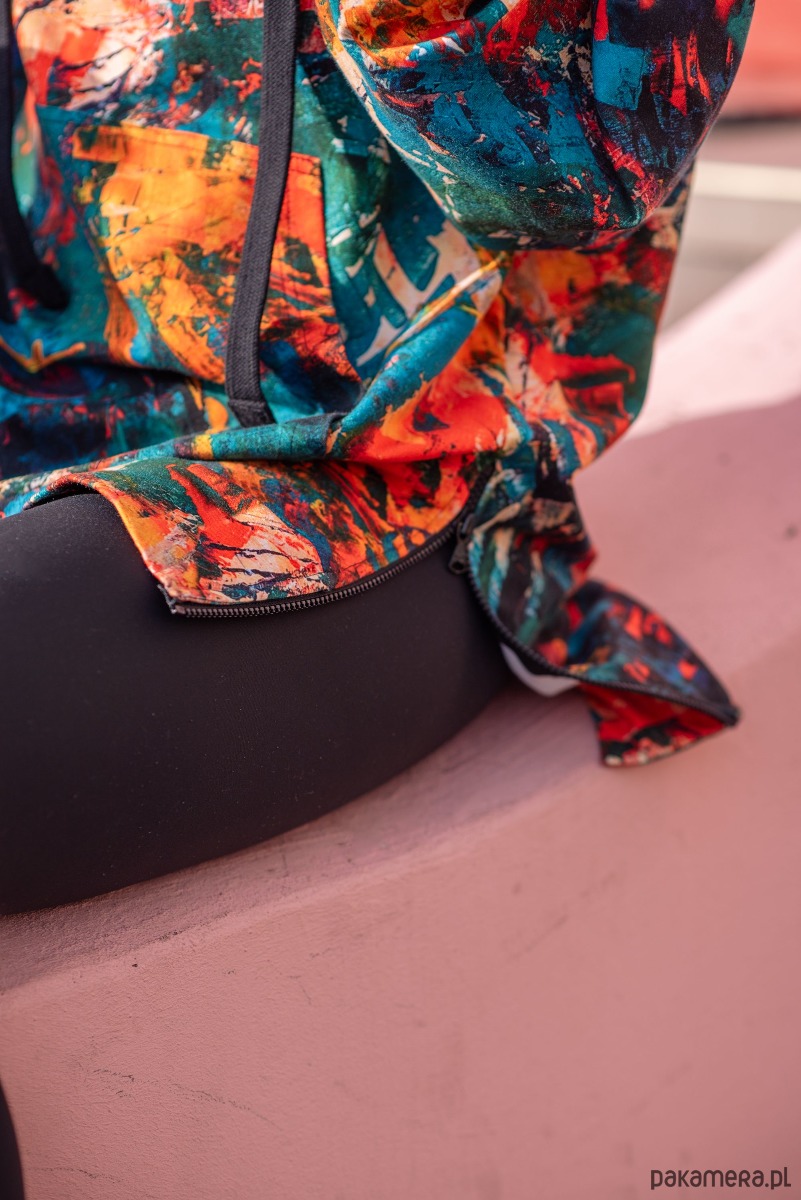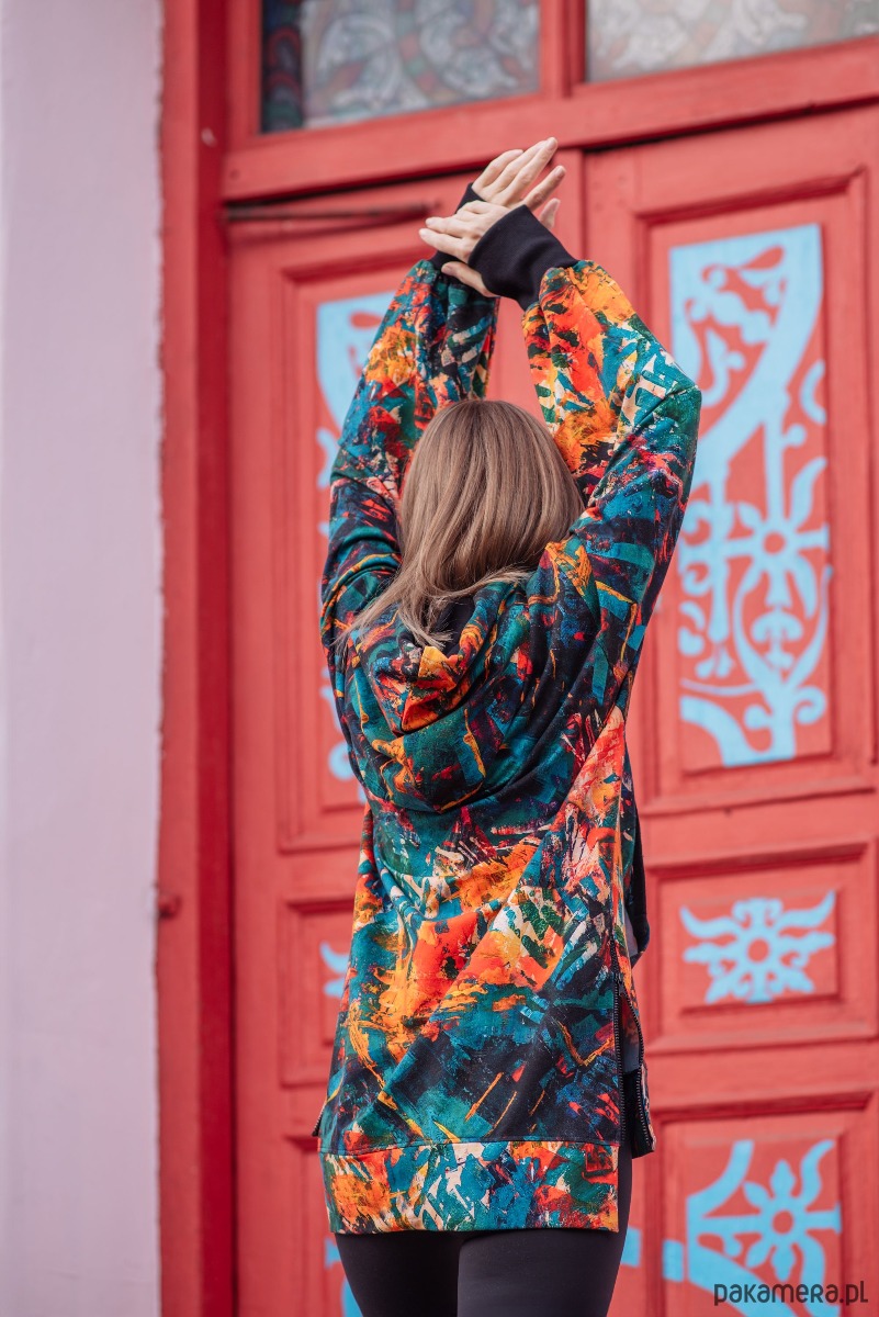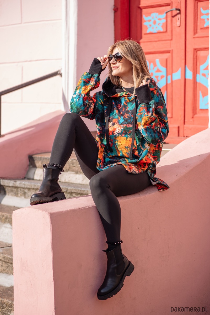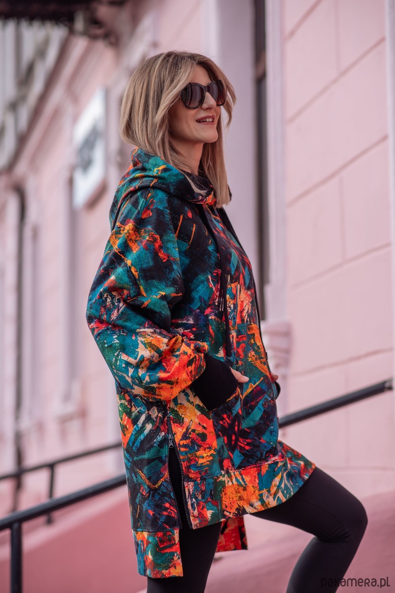 Bluza oversaizowa z opadającymi ramionami. Bardzo oryginalny krój, suwaki w szwach bocznych, kaptur pod szyją w formie komina, kieszeń kangurka. Tył dłuższy przód krótszy. Rękawy szerokie ,ściągacz z otworem na kciuk.