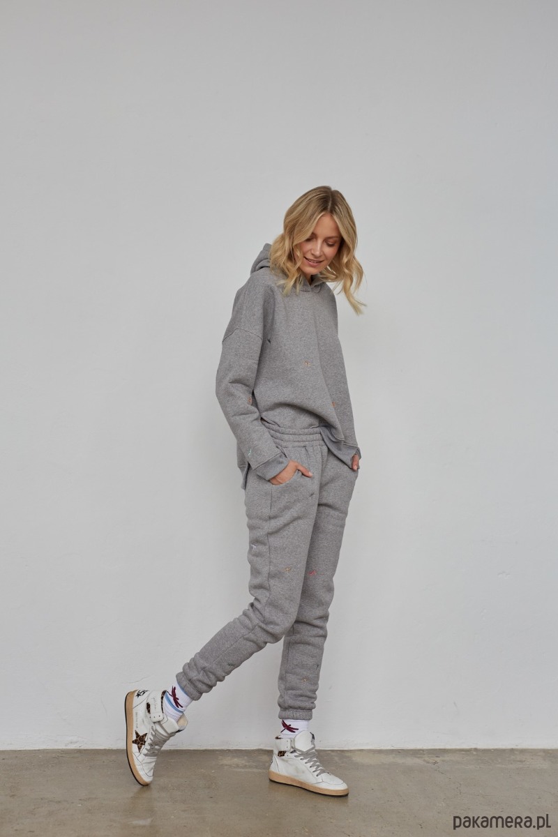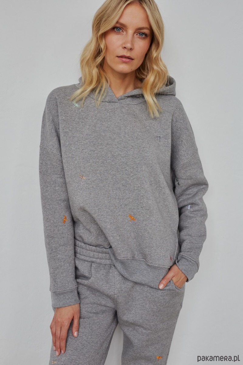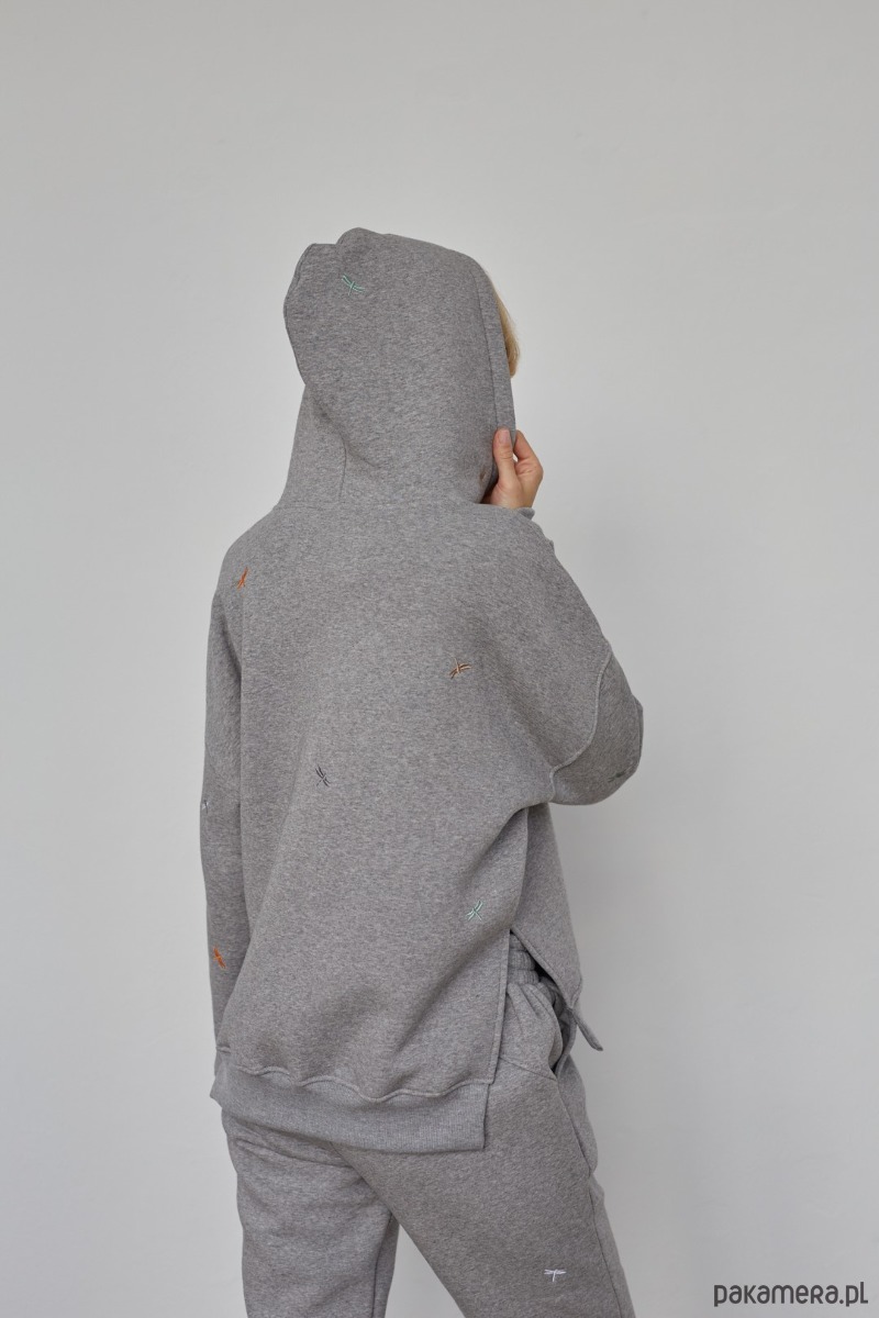 Bluza o kroju oversize z kapturem i drobnymi, starannie wyhaftowanymi kolorowymi ważkami. Wykonana ze średnio grubej, mięsistej, specjalnie uszlachetnianej dresówki. Melanże mają zazwyczaj w składzie więcej poliestru niż podają producenci, są natomiast na polskim rynku firmy, które produkują melanże ze 100% bawełnianej przędzy, które zawierają tylko minimalną ilość poliestru pomiędzy włóknami od spodniej strony, dzięki czemu melanżowe dzianiny i jasne i ciemne nie mechacą się. Mamy to przetestowane ;)