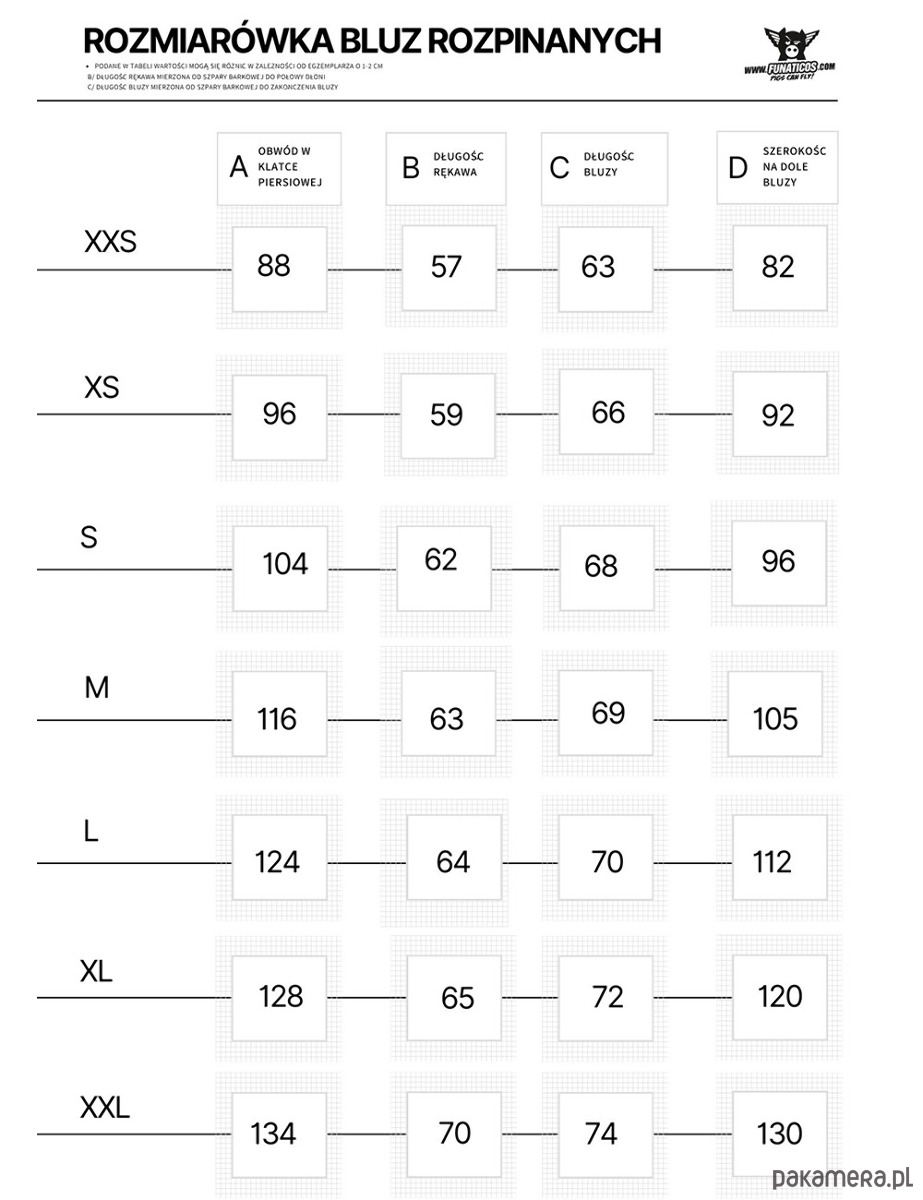 Koszt bluzy szytej na miarę oraz wykraczającej poza rozmiar XL jest wyższy od standardowej ceny o 40 złotych.